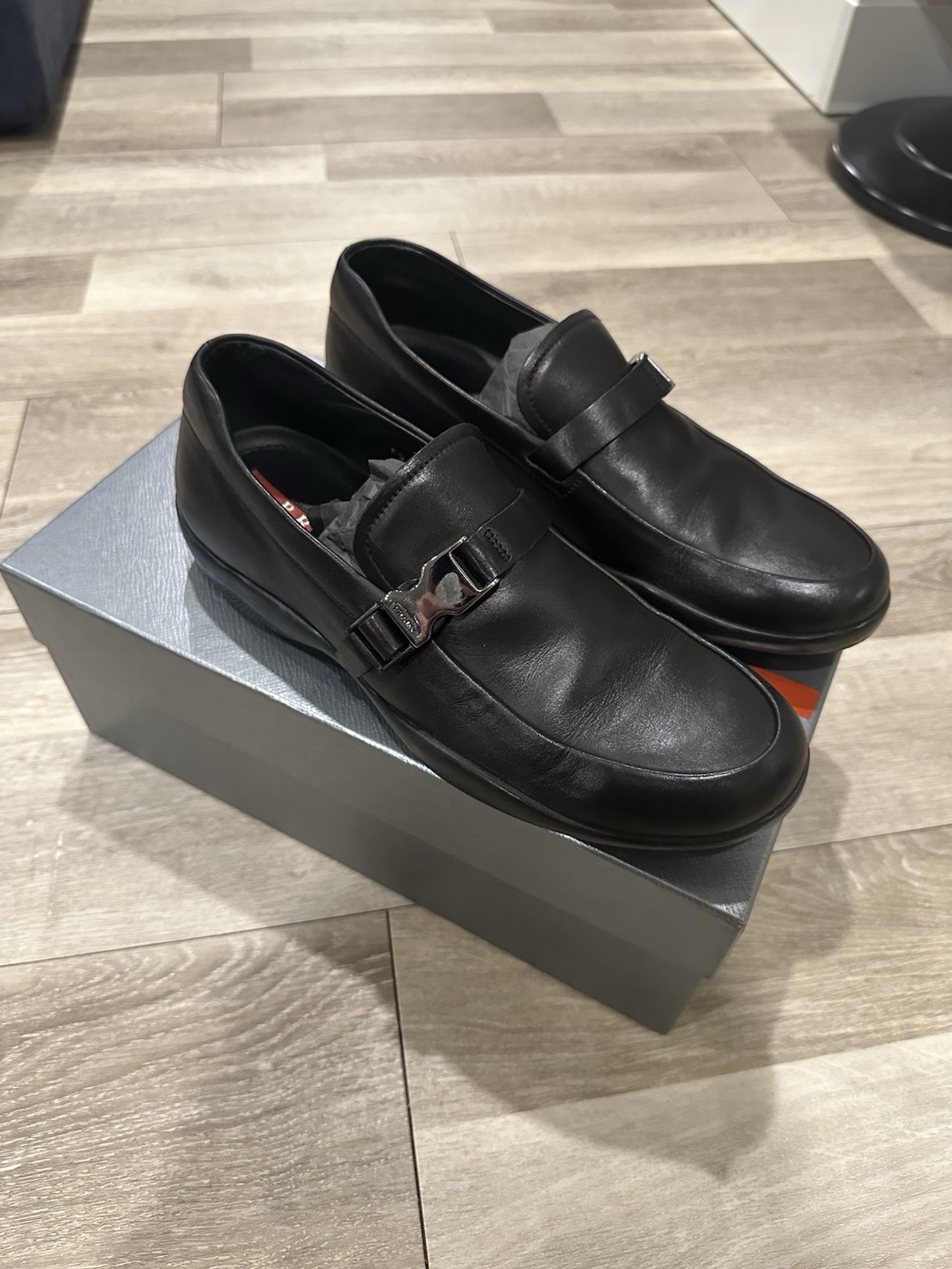 Amazing Prada loafers with a sporty sole that will last forever. Could be worn really well casual or dressed up. Bought from Harry Rosen for over $500 Prada size 7 fits US 8 Small mark on one buckle could be removed with acetone Crafted with the modern man in mind, these Prada loafers exude understated elegance. The sleek black leather upper provides a versatile look that transitions effortlessly from office wear to evening attire. Designed for comfort and style, these loafers are a timeless addition to any discerning gentleman's wardrobe. In size US 8, these loafers offer a relaxed fit without compromising on sophistication. The durable construction ensures longevity, while the classic design maintains a sharp, contemporary profile. Ideal for those who appreciate the finer details in their everyday attire, these Prada loafers are a subtle nod to luxury and refinement.