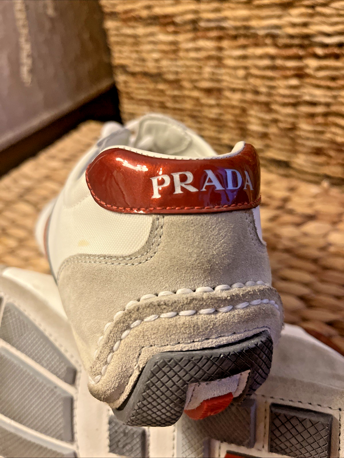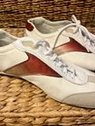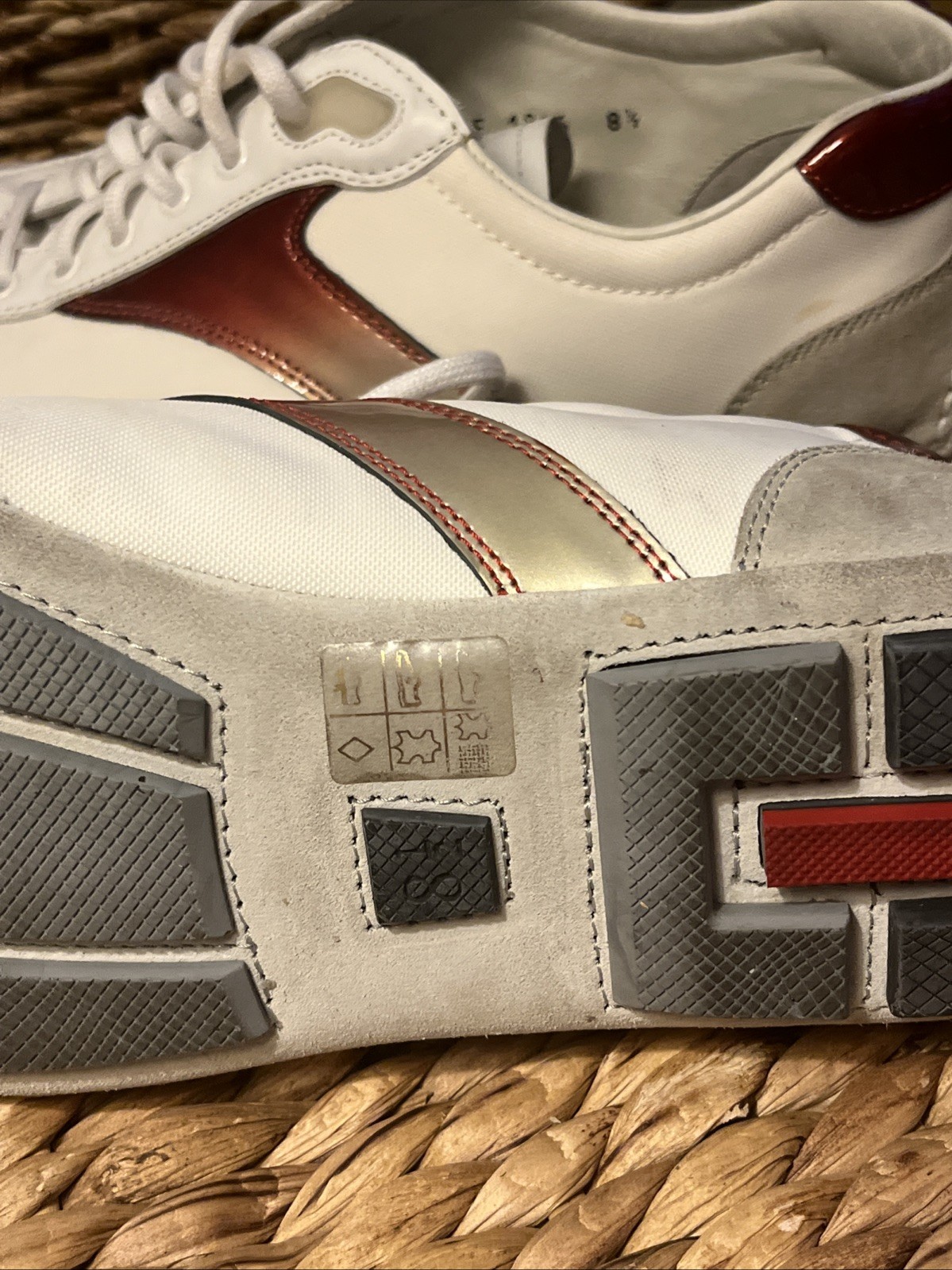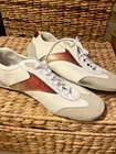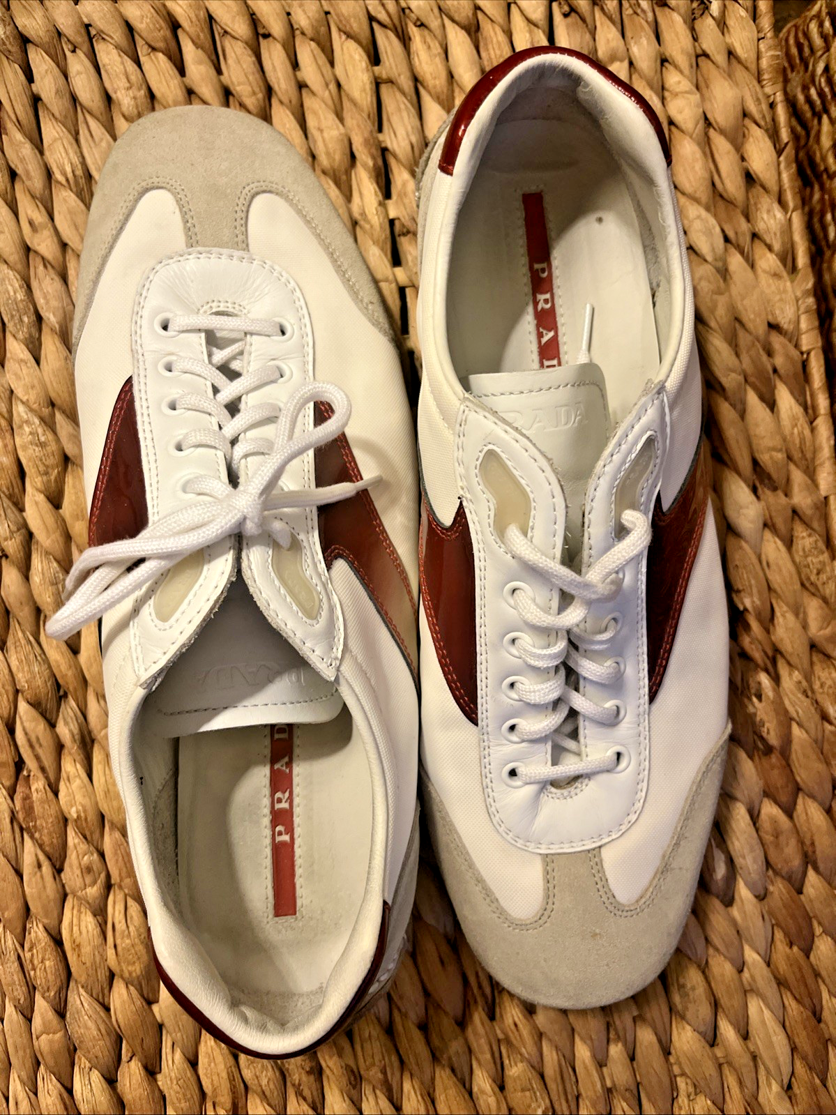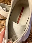 EXCELLENT CONDITION Worn only ONCE! This almost new pair of Prada suede Tio 4E 1816 sneakers is a men’s size 8.5 and has the Prada tongue marking, insole stripe logo, sole stripe, and heel logo. The color details are a fade red/maroon. The white canvas shoe has gray suede toe and heel detailing, leather lace box and top trim and maroon to red graphic side and back designs.