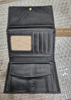 This is a Vintage Prada Milano Black Pebbled Leather Ladies Trifold Wallet. It’s a beautiful, stylish and sophisticated designer accessory crafted in Milano Italy. This vintage piece has never been used, making it a pristine addition to any woman's collection. The snap-closure trifold wallet (6” x 4”) features a solid black color with the signature Prada embossed logo accent, a classic trifold design, and practical features such as credit card slots, a bill compartment, additional compartments, with a snap closure coin pocket. Made from high-quality leather, this wallet exudes elegance and functionality for the modern woman on the go.