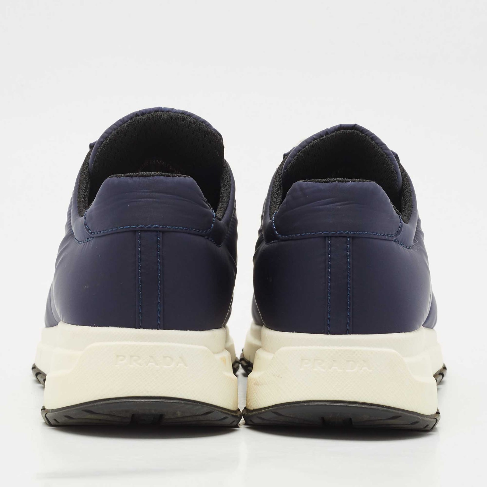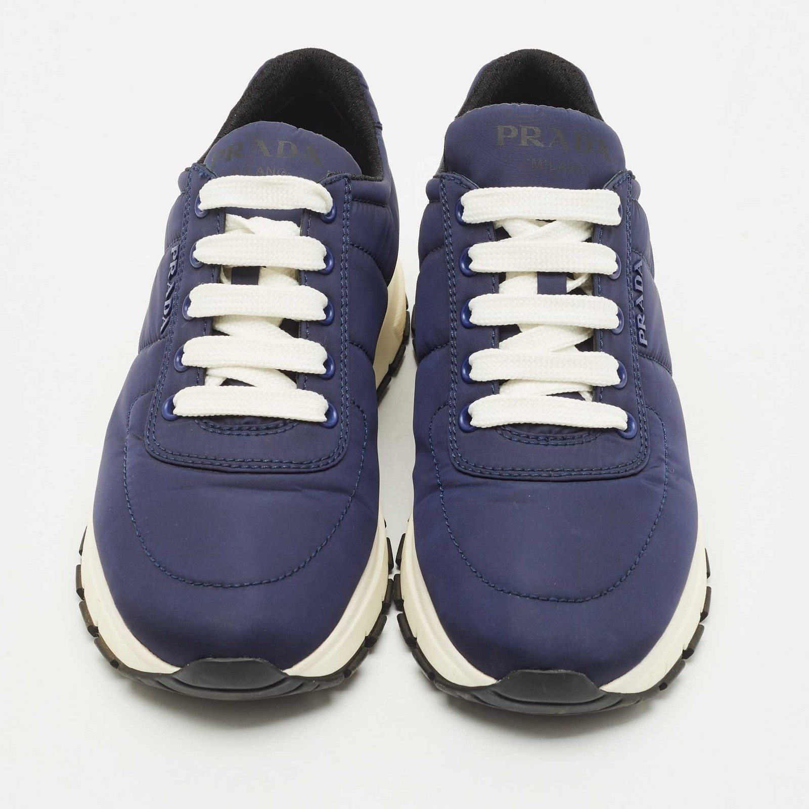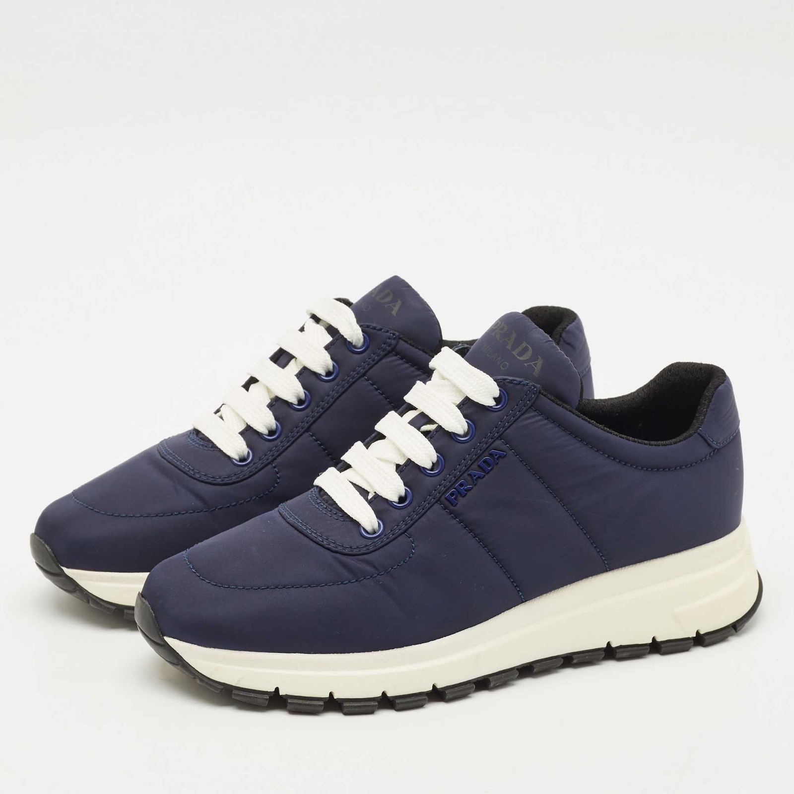 Sleek and sporty, these Prada Prax 01 sneakers are crafted from smooth black leather with a minimalist low top silhouette. Featuring tonal detailing and the signature logo on the side, they blend luxury with everyday versatility. The perfect fusion of high fashion and street ready comfort.Certified by The Luxury Closet - This item has gone through a detailed authentication process overseen by our experts. We offer a lifetime guarantee of authenticity on all our items. Import duties, taxes and charges are not included in the item price. These charges are the buyers responsibility. Please check with your country’s customs office to determine what these additional cost will be prior to buying. Our eBay Store About Us Contact Us Add to Favorite Sellers Prada Navy Blue Nylon Prax 01 Low Top Sneakers Size 37.5 $404.8 Sleek and sporty, these Prada Prax 01 sneakers are crafted from smooth black leather with a minimalist low top silhouette. Featuring tonal detailing and the signature logo on the side, they blend luxury with everyday versatility. The perfect fusion of high fashion and street ready comfort. Product Details Brand Color Navy Blue Dimensions Material Nylon Size 37.5 Outsole Width Outsole Length Heel Height Includes Certified by The Luxury Closet This item has gone through a detailed authentication process overseen by our experts. We offer a lifetime guarantee of authenticity on all our items. How We Check The in-house team of experts at The Luxury Closet is highly trained to verify the authenticity and the condition of the luxury products. They ensure that only 100% authentic items are put on sale.The evaluation process is unique with its own mix of assessment criteria and differs according to the category. Each item is evaluated based on the following combination of hallmarks, hardware, stitching, symmetry, material, craftsmanship, stamping, codes, hologram stickers, and packaging. Our authenticators also check if the items have been modified or amended (e.g., aftermarket diamonds, replaced batteries, repaired bags, etc.) International Buyers Import duties, taxes and charges are not included in the item price. These charges are the buyers responsibility. Please check with your country’s customs office to determine what these additional cost will be prior to buying.