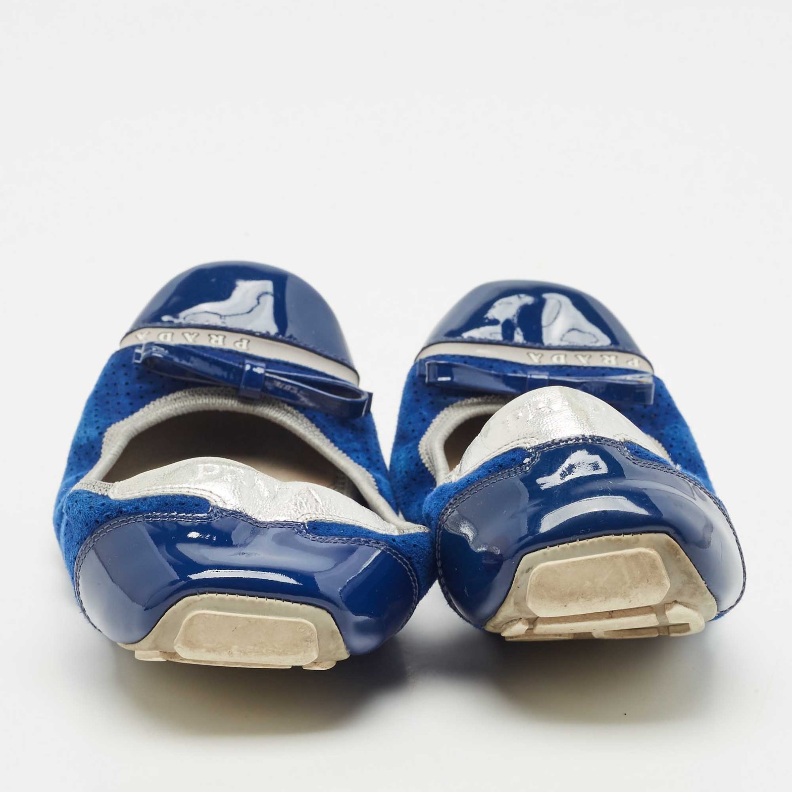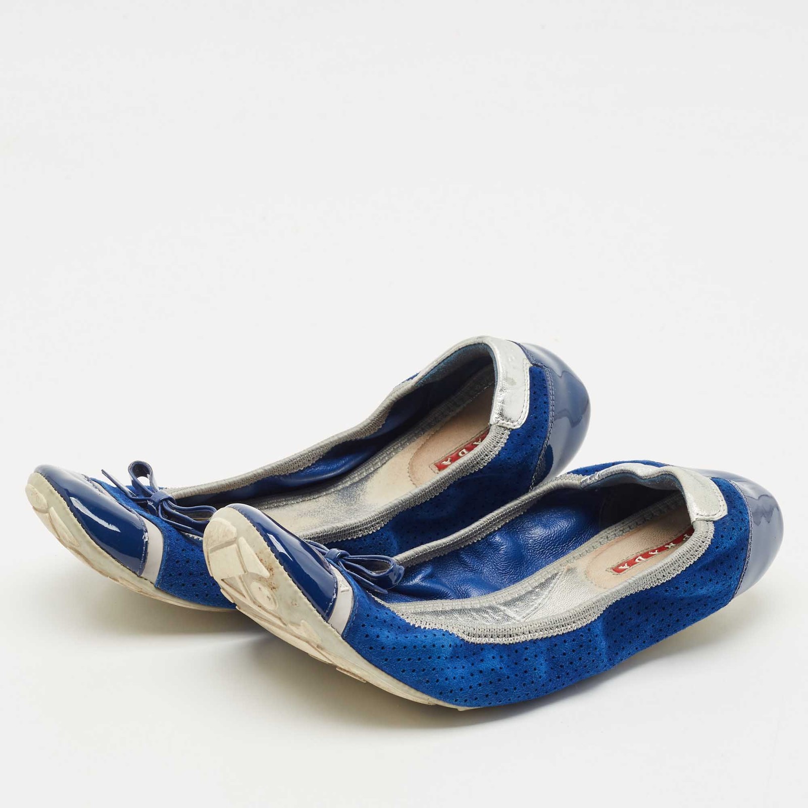 These Prada ballet flats offer the joy of comfort. They feature a patent leather and leather exterior with logo detailing on the front and the counters and have a scrunch style to give you a good fit. The pair is complete with comfortable insoles for all day ease.Certified by The Luxury Closet - This item has gone through a detailed authentication process overseen by our experts. We offer a lifetime guarantee of authenticity on all our items. Import duties, taxes and charges are not included in the item price. These charges are the buyers responsibility. Please check with your country’s customs office to determine what these additional cost will be prior to buying. Our eBay Store About Us Contact Us Add to Favorite Sellers Prada Navy Blue/Silver Patent Leather and Nubuck Leather Scrunch Ballet Flats Size 38 $229.9 These Prada ballet flats offer the joy of comfort. They feature a patent leather and leather exterior with logo detailing on the front and the counters and have a scrunch style to give you a good fit. The pair is complete with comfortable insoles for all day ease. Product Details Brand Color Navy Blue Dimensions Material Nubuck Leather, Patent Leather Size 38 Outsole Width Outsole Length Heel Height Includes Certified by The Luxury Closet This item has gone through a detailed authentication process overseen by our experts. We offer a lifetime guarantee of authenticity on all our items. How We Check The in-house team of experts at The Luxury Closet is highly trained to verify the authenticity and the condition of the luxury products. They ensure that only 100% authentic items are put on sale.The evaluation process is unique with its own mix of assessment criteria and differs according to the category. Each item is evaluated based on the following combination of hallmarks, hardware, stitching, symmetry, material, craftsmanship, stamping, codes, hologram stickers, and packaging. Our authenticators also check if the items have been modified or amended (e.g., aftermarket diamonds, replaced batteries, repaired bags, etc.) International Buyers Import duties, taxes and charges are not included in the item price. These charges are the buyers responsibility. Please check with your country’s customs office to determine what these additional cost will be prior to buying.