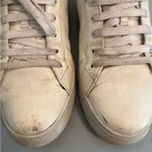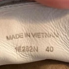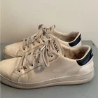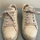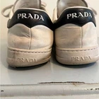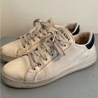 This is an authentic pair of PRADA Vitello Plume Logo Low Top Sneakers size 40 in White and Black. These sneakers are crafted of smooth white leather and feature the Prada logo printed on the back in white, white laces and white rubber soles. Pre-owned condition with signs of wear-please see photos.