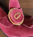 Elevate your style with these stunning Prada pumps. The ultra high block heel and red suede material will make you stand out in any occasion. The fringe and gold tone logo button add a touch of chic to these classic designer heels. These pumps feature a round toe and buckle closure for a comfortable fit. The leather and suede upper material is of the highest quality, made in Italy. These shoes are vintage and have not been customized. Perfect for any fashionable woman, these Prada pumps are a must-have addition to your shoe collection.