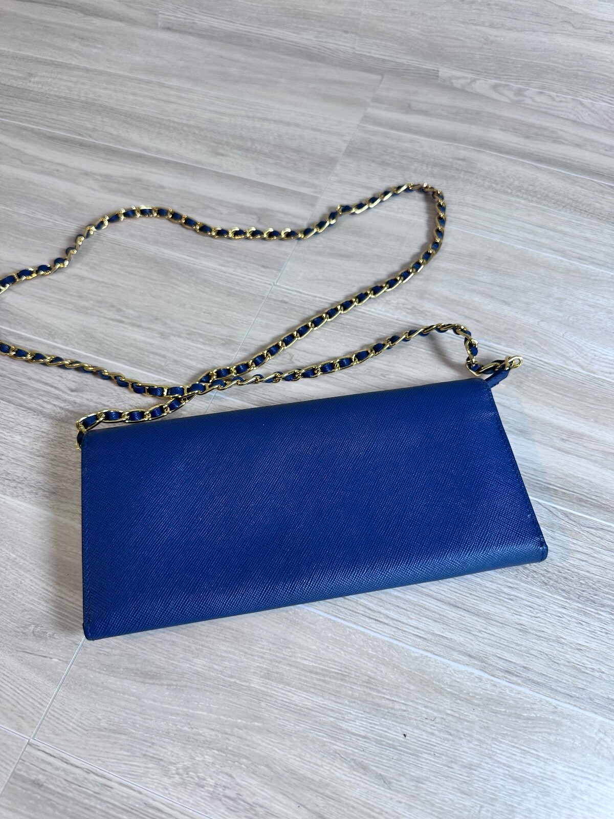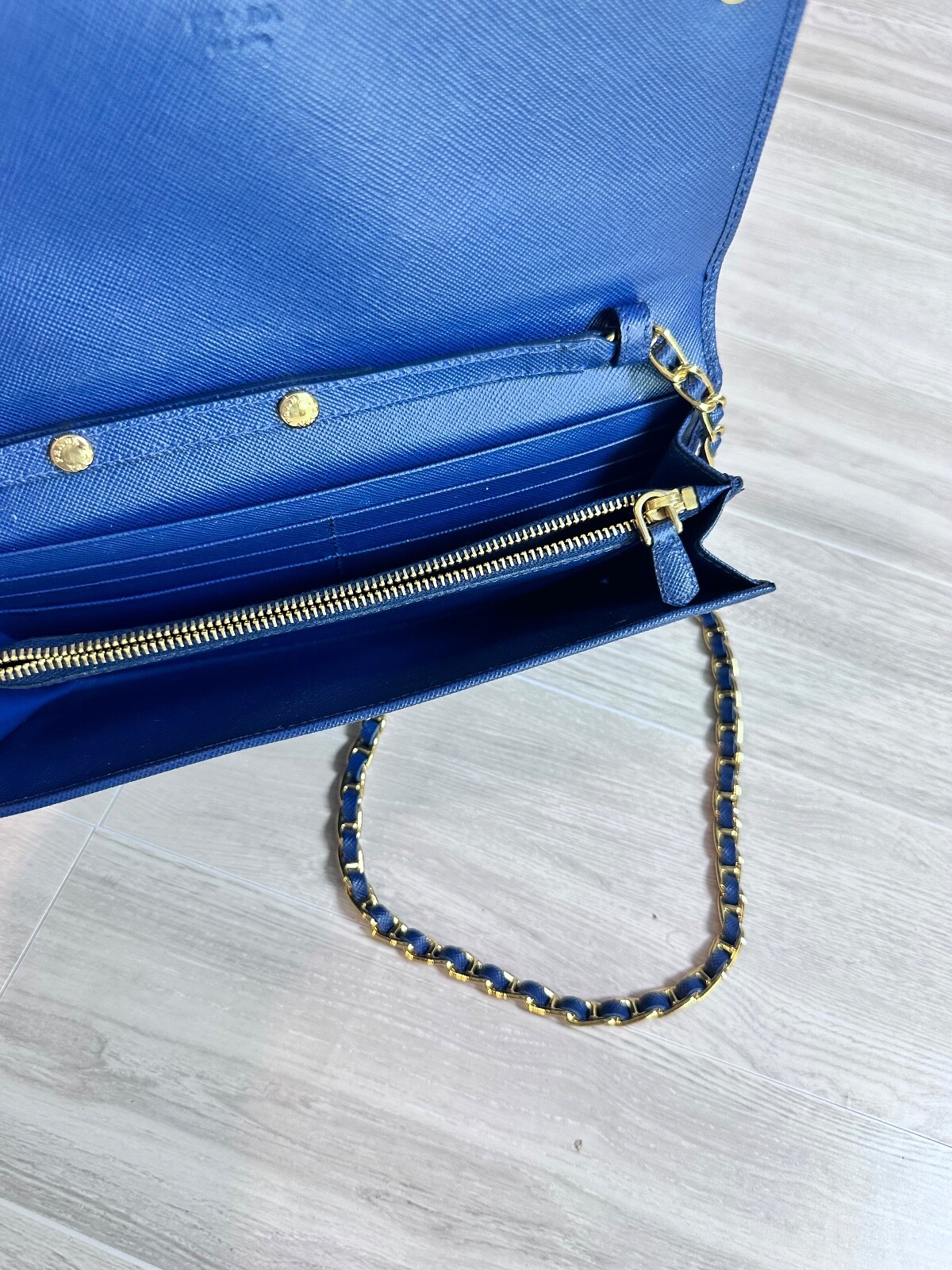 Prada Crossbody Bag Blue Saffiano Metal Leather Saffiano Leather Gold-Tone Hardware Chain-Link Shoulder Strap Chain-Link Accents Faille Lining & Four Interior Pockets with Card Slots Snap Closure at Front Includes Box Details Estimated item measurements Shoulder Strap Drop: 20.5" Height: 4.25" Width: 8.75" Depth: 1" Gender: Women Item # PRA1094786 Excellent condition; never used