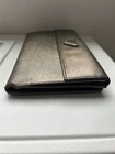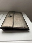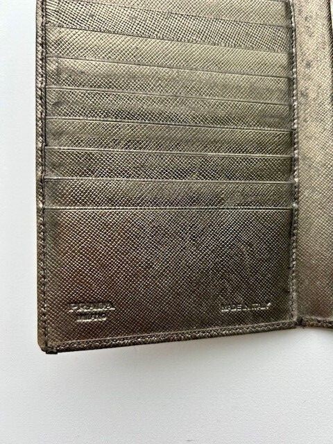 This pre-owned authentic Prada metallic wallet is made from premium Saffiano leather in Italy. This bifold wallet features a convenient snap closure and ample storage space for all your credit cards and other essentials. The golden metallic color adds a touch of glamour to your overall look, while the leather material guarantees its durability and lasting beauty. With its superior craftsmanship and attention to detail, this wallet is a must-have for any fashion-forward woman who values both style and function. This was purchased in Switzerland. Enameled metal triangle logo Snap closure 21 card slots 5 bill compartments Snap closure Made in Italy H: 7.42 inches (19cm) W: 4.25 inches (11cm) This wallet needs to be cleaned and conditioned.