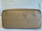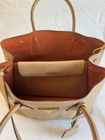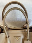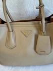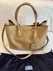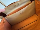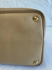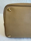 This Prada Saffiano Cuir Leather Double Handle Medium Tote in Noisette features a sophisticated design with orange accents, including double handles and lining. The bag is crafted in Italy with high-quality leather and gold-tone hardware, giving it a luxurious touch. The tote offers a spacious interior lined with buttery soft calf skin, making it a stylish and practical accessory for women on the go.