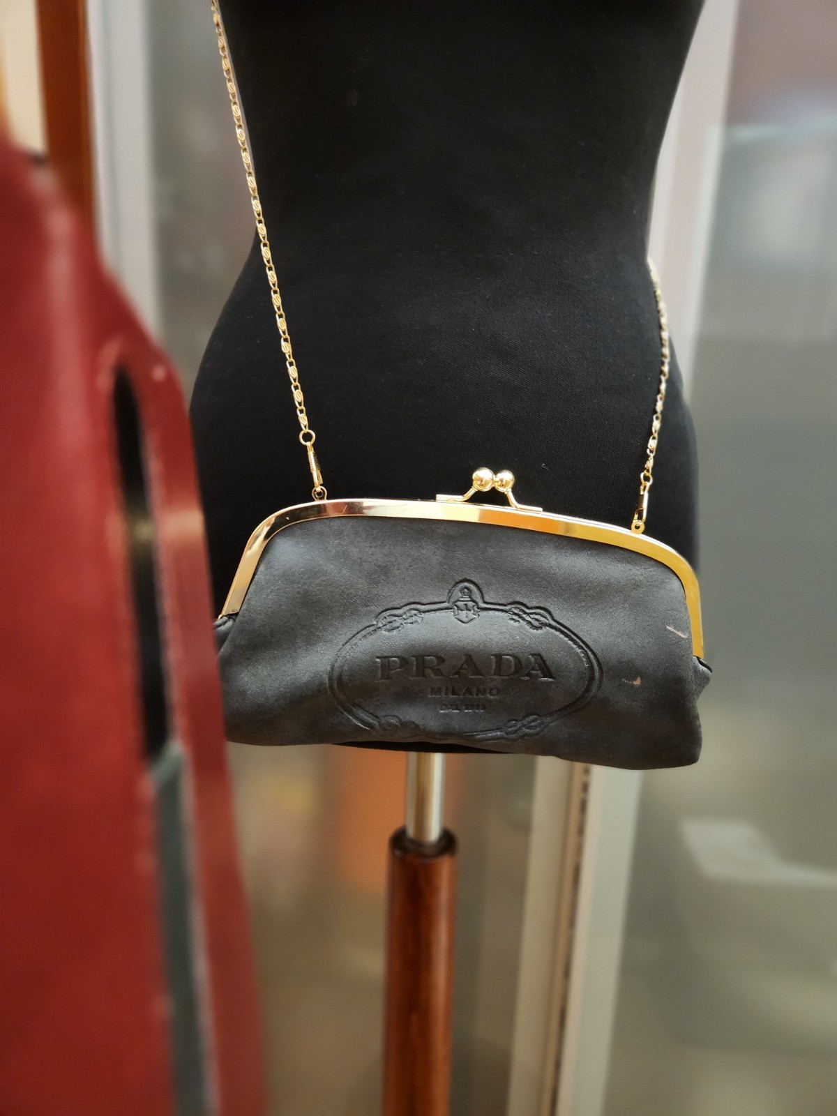 Marca:PRADAMateriale esterno:PelleCountry of Origin:ItalyMateriale della fodera:PelleStile:TracollaCaratteristiche:TracollaDimensioni:MiniColore esterno:NeroChiusura:A bacio (clic clac)Reparto:DonnaVintage:SìLarghezza della borsa:22 cmTipo di manico:Da spalla, a tracollaFantasia:Tinta unitaMateriale del manico, tracolla:MetalloLinea prodotto:PRADA Nylon