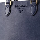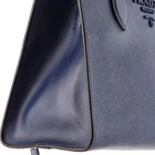These are professional pictures of the actual item offered by Rebag. Condition: Very good. Creasing on strap and exterior, splitting on opening wax edges, minor wear in interior, scratches on hardware. Accessories: Clochette, With Strap Measurements: Handle Drop 4.5", Height 8", Width 11", Depth 5", Strap Drop 17" Designer: Prada Model: Monochrome Tote Saffiano with City Calf Small Exterior Material: Leather Exterior Color: Blue Interior Material: Fabric, Leather Interior Color: Black, Blue Hardware Color: Gold Item Number: 298423/10