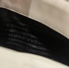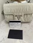 The Prada Chain Flap Shoulder Bag Nappa Gaufre Small in white is a stylish crossbody bag featuring an argyle/diamond pattern on leather exterior. The catch fastener closure and silver hardware add a touch of luxury to this small-sized bag, perfect for women on the go. The white leather handle/strap and black silk lining make it a versatile accessory for any outfit, while the iconic PRADA branding ensures a touch of sophistication.