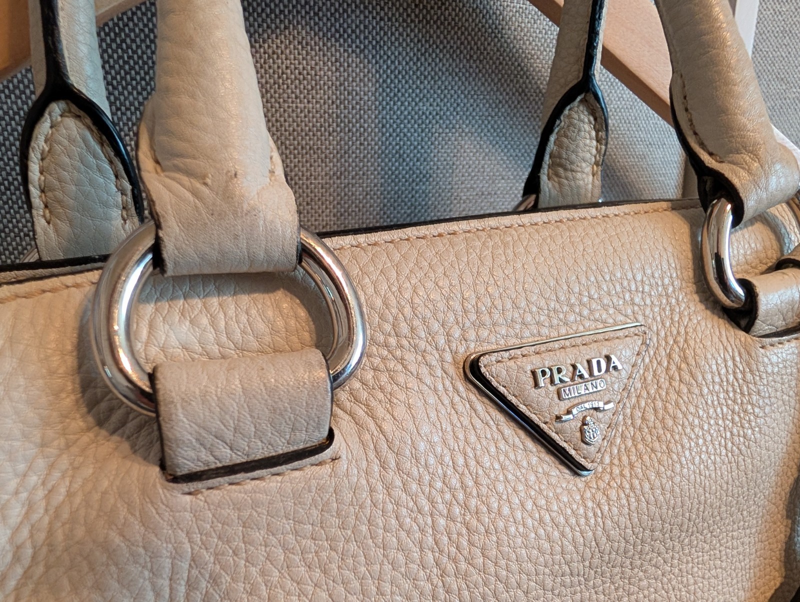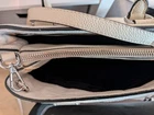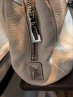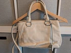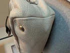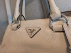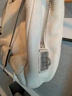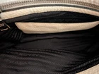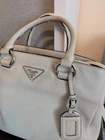 The PRADA Soft White Satchel Bag is a stylish and versatile accessory for women. Made of pebbled leather with silver hardware, this medium-sized bag features a zip closure and a separate replacement detachable strap included for added convenience. The sleek design and fabric lining make it perfect for everyday use, while the included luggage tag and key holder add practicality to the overall package. Lock is not included. This satchel/top handle bag is a must-have addition to any wardrobe, combining elegance and functionality effortlessly. Clean interior, with minor outside wear. Crossbody strap is not Prada, but is pebbled leather with silver hardware and matches color of bag. Lock is missing, but there is a leather key attachment to utilize. Lots of compartments, good medium size, a great neutral color for all seasons wardrobes. A must-have for Summer 🌞