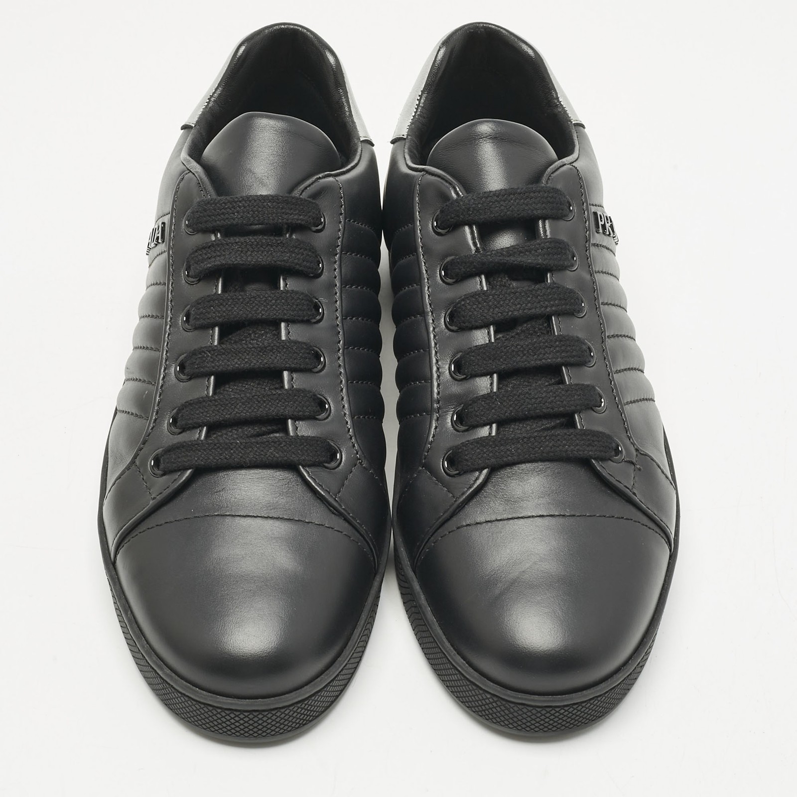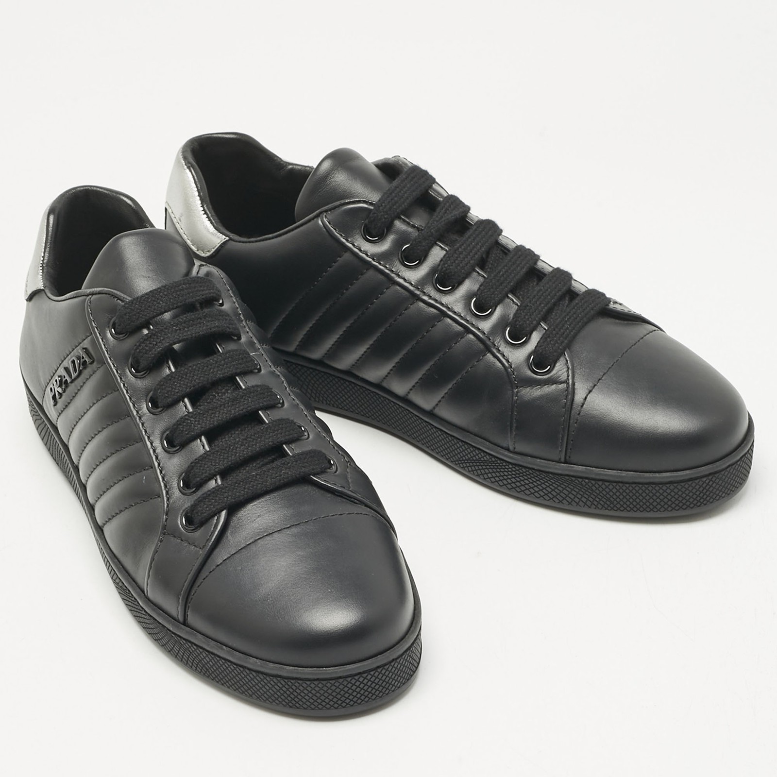 Crafted for comfort and versatility, Prada Sport’s black leather sneakers feature a streamlined silhouette with tonal lace up detailing. Understated yet sleek, they complement relaxed tailoring, off duty outfits, and modern travel wardrobes.Certified by The Luxury Closet - This item has gone through a detailed authentication process overseen by our experts. We offer a lifetime guarantee of authenticity on all our items. Import duties, taxes and charges are not included in the item price. These charges are the buyers responsibility. Please check with your country’s customs office to determine what these additional cost will be prior to buying. Our eBay Store About Us Contact Us Add to Favorite Sellers Prada Sport Black Leather Lace Up Sneakers Size 37.5 $469.7 Crafted for comfort and versatility, Prada Sport’s black leather sneakers feature a streamlined silhouette with tonal lace up detailing. Understated yet sleek, they complement relaxed tailoring, off duty outfits, and modern travel wardrobes. Product Details Brand Color Black Dimensions Material Leather Size 37.5 Outsole Width Outsole Length Heel Height Includes Certified by The Luxury Closet This item has gone through a detailed authentication process overseen by our experts. We offer a lifetime guarantee of authenticity on all our items. How We Check The in-house team of experts at The Luxury Closet is highly trained to verify the authenticity and the condition of the luxury products. They ensure that only 100% authentic items are put on sale.The evaluation process is unique with its own mix of assessment criteria and differs according to the category. Each item is evaluated based on the following combination of hallmarks, hardware, stitching, symmetry, material, craftsmanship, stamping, codes, hologram stickers, and packaging. Our authenticators also check if the items have been modified or amended (e.g., aftermarket diamonds, replaced batteries, repaired bags, etc.) International Buyers Import duties, taxes and charges are not included in the item price. These charges are the buyers responsibility. Please check with your country’s customs office to determine what these additional cost will be prior to buying.
