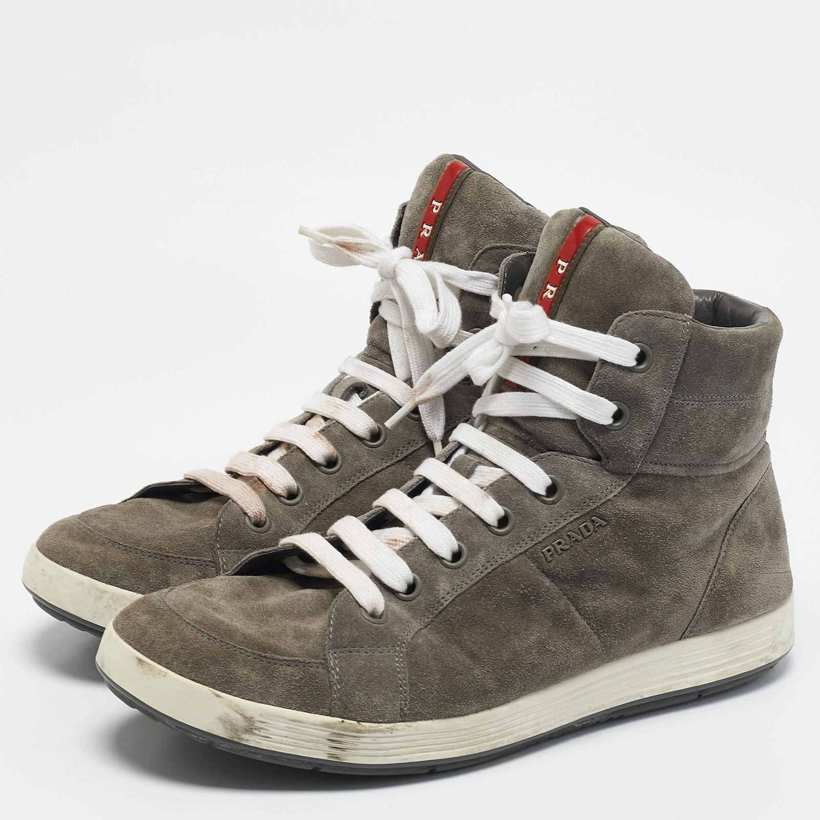 Crafted for the style conscious mover, these Prada sneakers in grey suede leather merge luxury craftsmanship with a sporty edge. With tonal detailing and a sleek silhouette, they’re a refined option for elevated off duty looks.Certified by The Luxury Closet - This item has gone through a detailed authentication process overseen by our experts. We offer a lifetime guarantee of authenticity on all our items. Import duties, taxes and charges are not included in the item price. These charges are the buyers responsibility. Please check with your country’s customs office to determine what these additional cost will be prior to buying. Our eBay Store About Us Contact Us Add to Favorite Sellers Prada Sport Grey Suede Leather High Top Sneakers Size 45 $185.9 Crafted for the style conscious mover, these Prada sneakers in grey suede leather merge luxury craftsmanship with a sporty edge. With tonal detailing and a sleek silhouette, they’re a refined option for elevated off duty looks. Product Details Brand Color Grey Dimensions Material Suede Size 45 Outsole Width Outsole Length Heel Height Includes Certified by The Luxury Closet This item has gone through a detailed authentication process overseen by our experts. We offer a lifetime guarantee of authenticity on all our items. How We Check The in-house team of experts at The Luxury Closet is highly trained to verify the authenticity and the condition of the luxury products. They ensure that only 100% authentic items are put on sale.The evaluation process is unique with its own mix of assessment criteria and differs according to the category. Each item is evaluated based on the following combination of hallmarks, hardware, stitching, symmetry, material, craftsmanship, stamping, codes, hologram stickers, and packaging. Our authenticators also check if the items have been modified or amended (e.g., aftermarket diamonds, replaced batteries, repaired bags, etc.) International Buyers Import duties, taxes and charges are not included in the item price. These charges are the buyers responsibility. Please check with your country’s customs office to determine what these additional cost will be prior to buying.
