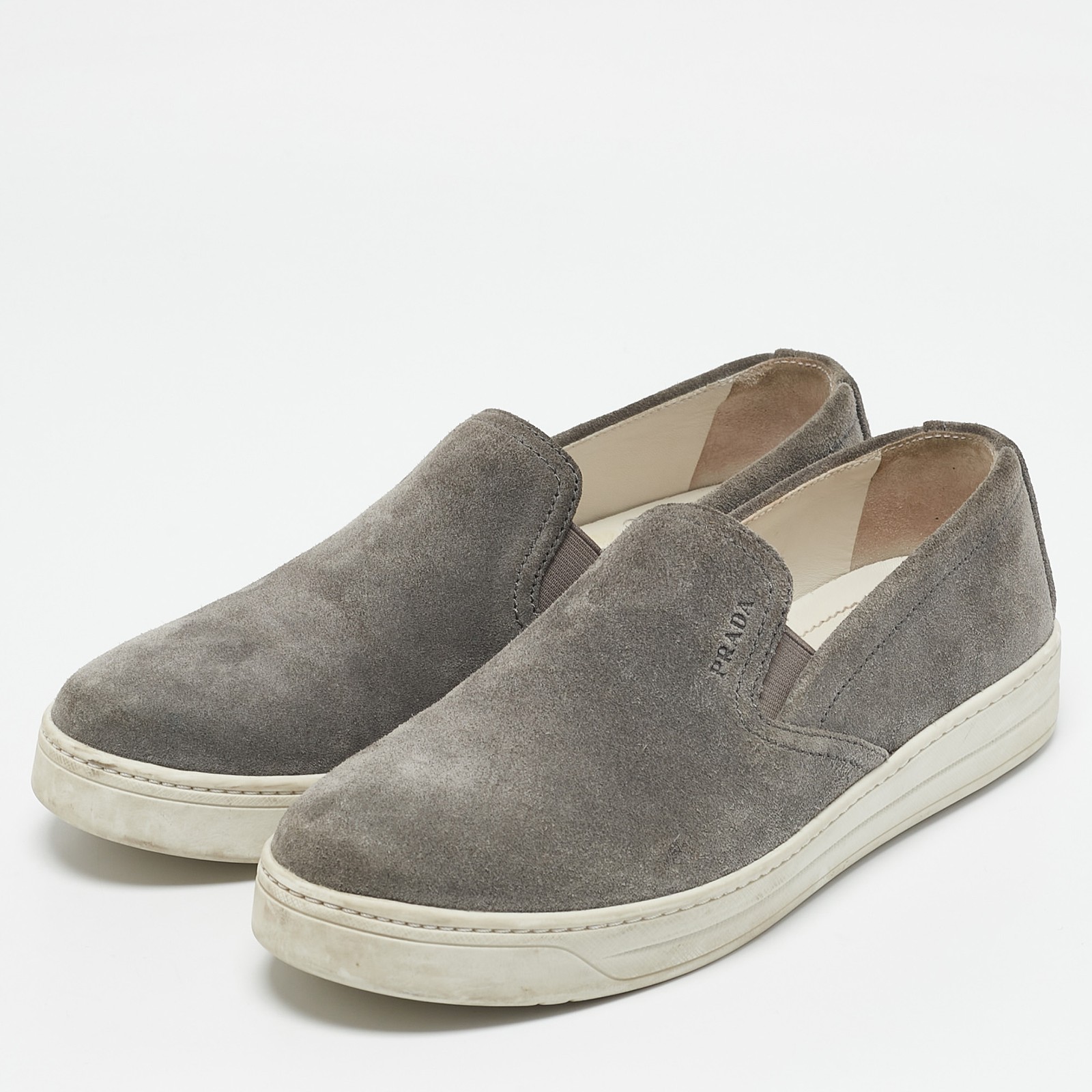Let this comfortable pair be your first choice when youre out for a long day. These Prada Sport shoes have well sewn uppers beautifully set on durable soles.Certified by The Luxury Closet - This item has gone through a detailed authentication process overseen by our experts. We offer a lifetime guarantee of authenticity on all our items. Import duties, taxes and charges are not included in the item price. These charges are the buyers responsibility. Please check with your country’s customs office to determine what these additional cost will be prior to buying. Our eBay Store About Us Contact Us Add to Favorite Sellers Prada Sport Grey Suede Slip On Sneakers Size 38.5 $172.7 Let this comfortable pair be your first choice when youre out for a long day. These Prada Sport shoes have well sewn uppers beautifully set on durable soles. Product Details Brand Color Grey Dimensions Material Suede Size 38.5 Outsole Width Outsole Length Heel Height Includes Certified by The Luxury Closet This item has gone through a detailed authentication process overseen by our experts. We offer a lifetime guarantee of authenticity on all our items. How We Check The in-house team of experts at The Luxury Closet is highly trained to verify the authenticity and the condition of the luxury products. They ensure that only 100% authentic items are put on sale.The evaluation process is unique with its own mix of assessment criteria and differs according to the category. Each item is evaluated based on the following combination of hallmarks, hardware, stitching, symmetry, material, craftsmanship, stamping, codes, hologram stickers, and packaging. Our authenticators also check if the items have been modified or amended (e.g., aftermarket diamonds, replaced batteries, repaired bags, etc.) International Buyers Import duties, taxes and charges are not included in the item price. These charges are the buyers responsibility. Please check with your country’s customs office to determine what these additional cost will be prior to buying.