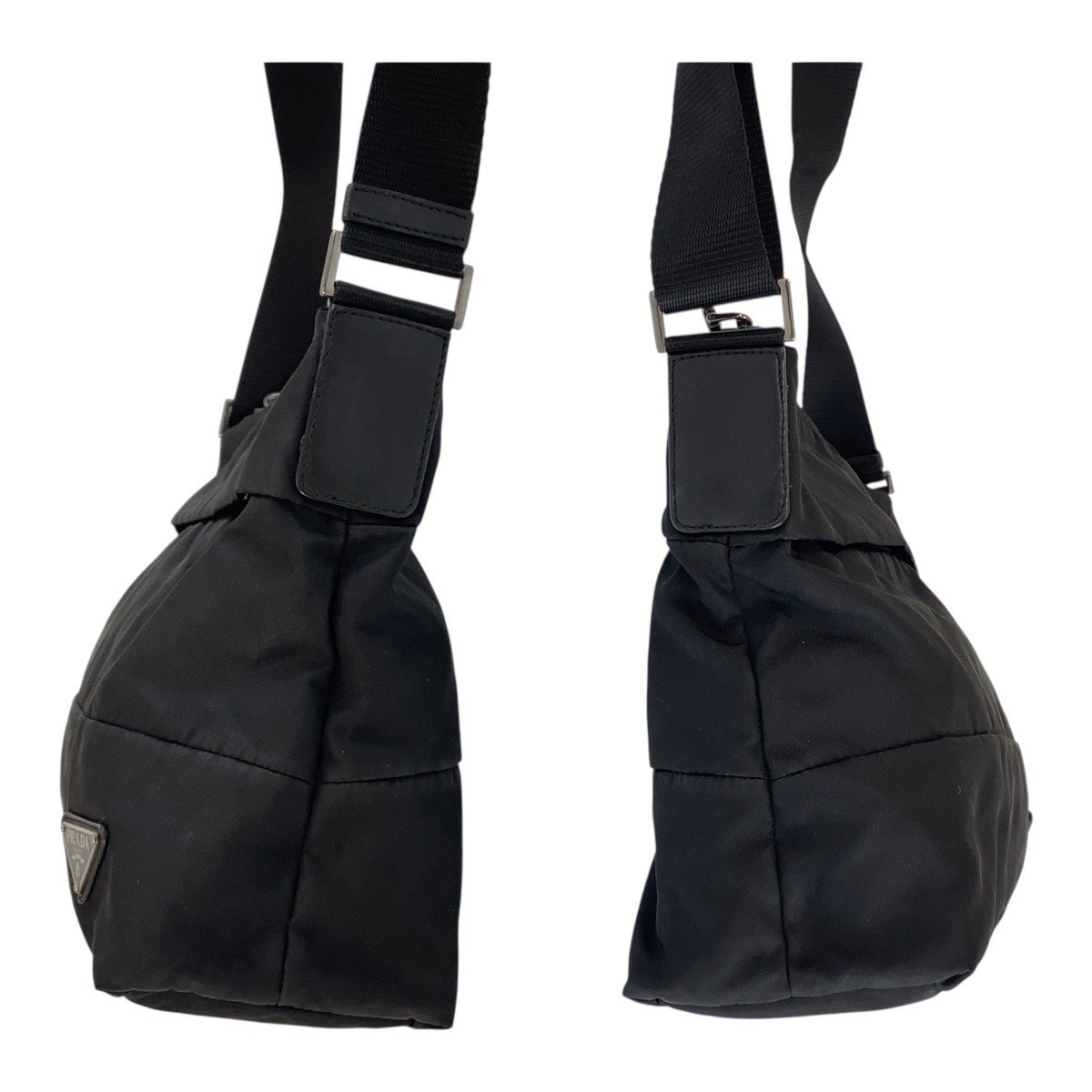 This Prada shoulder bag is sleek and practical—perfect for everyday use. The black nylon is durable, and the silver hardware adds a stylish touch. The adjustable strap makes it comfortable to wear, and the multiple pockets keep things organized. Despite minor signs of wear, it still looks great and functions flawlessly. A must-have for anyone who loves high-quality designer bags!