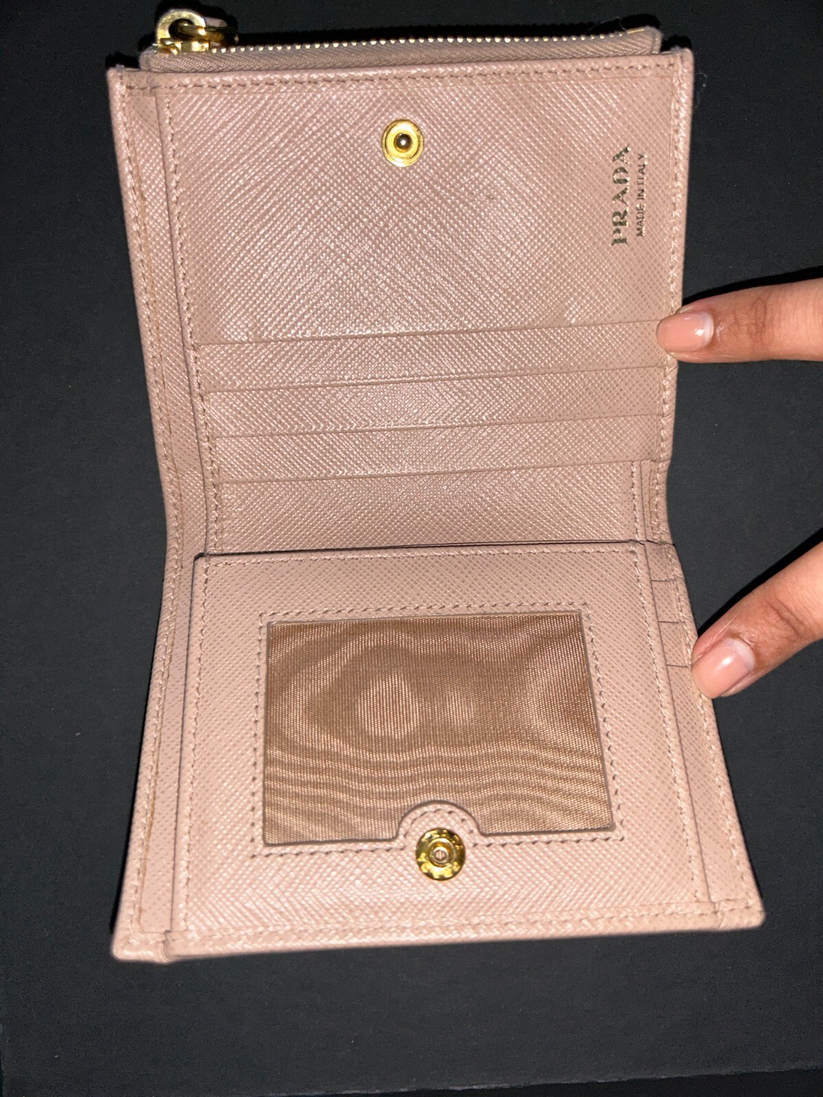 Crafted with impeccable attention to detail, the Prada Trifold Wallet Coin is a testament to the brand's commitment to luxury and style. The wallet is fashioned from premium Saffiano leather in a versatile beige hue, seamlessly blending sophistication with practicality.Designed for the modern woman, this wallet features a sleek trifold design, offering ample space for coins and essentials without the bulk. The coin compartment is complemented by additional card slots, ensuring that all your essentials are organized and readily accessible.