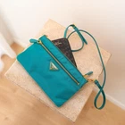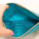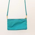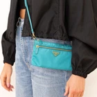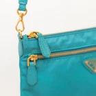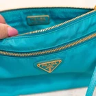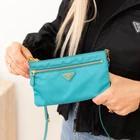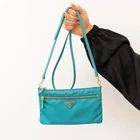 An absolute statement bag. Striking teal/turqoise blue Tessuto nylon fabric with Saffiano leather accents. Iconic Prada triangle logo to front with gold hardware. Even the lining of this bag is gorgeous. Can be worn on the shoulder, crossbody or the leather strap can be unclipped to be used as a clutch bag or purse. Comfortably fits a phone, cards, cash & lip gloss!