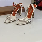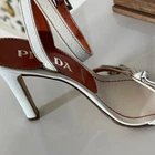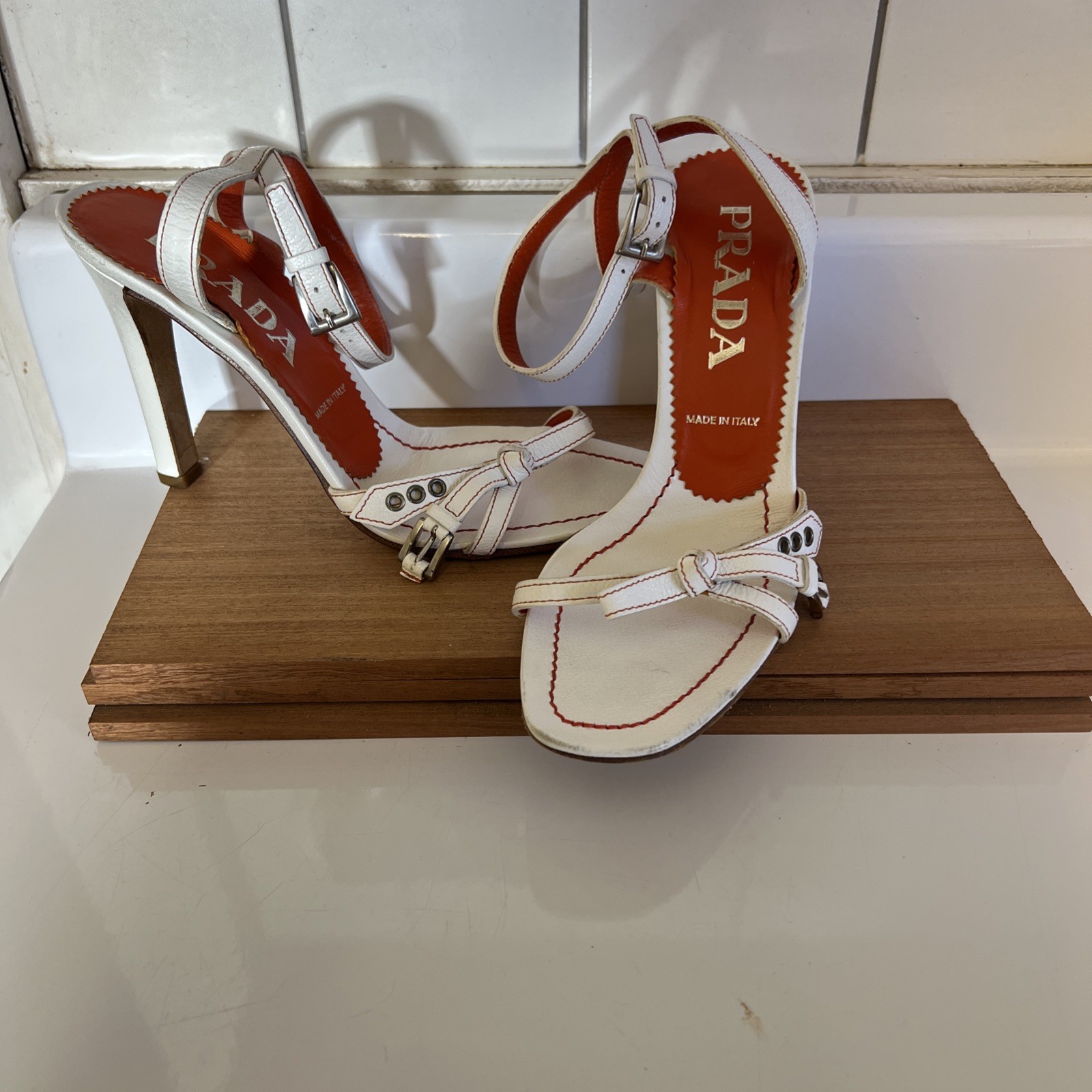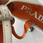 The Prada Vero Cuoio Leather High Heel Sandals in white and orange, size 36 for women, are a stylish and elegant choice for parties or cocktail events. Made in Italy, these strappy sandals feature a comfortable leather lining and insole, with a durable leather outsole. The ankle strap adds a touch of sophistication, making these heels a perfect addition to your summer wardrobe. Embrace the luxury and quality of Prada with these vintage-inspired yet modern sandals. These are my moms and have only been hers. They’re worn and well loved. I made sure to show any marks or dings. But these are in great overall condition and feature the original shoe bag. Great to add to anyone’s collection.