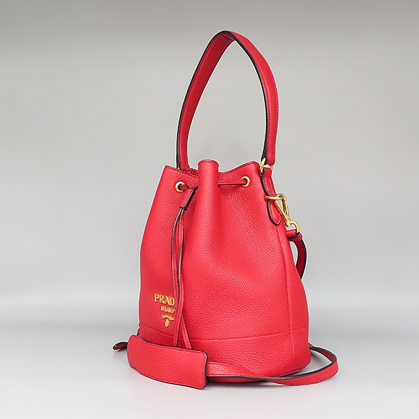 Size: 21 cm width/ 25 cm/ width 15 cm/ handle height 14 cm/ strap height ~55 cm Color: Red Accessories: Prada (Prada) 1BE018 VIT.DAINO NERO red leather gold logo bucket tote bag + cross strap [Cheonan Shinsegae Store]. The material is leather. There is a small multi-purpose storage pocket on the inside. The height of the strap is adjustable. A bucket bag made of saffiano leather with a feminine design. It has a triangle logo decoration; adjustable leather shoulder strap with detachable calfskin leather handle; leather shoulder pad with metal logo top, leather drawstring closure, 1 inner pocket, Prada logo nylon lining *Purchase note* The fabric strap is lost.