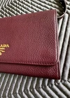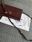 This listing is for an authentic Prada Wallet with detachable Strap in 'Vitello Grain' leather, with gold hardware. Prada describe the colour as 'Granato', which is a burgundy shade. Approximate dimensions are as follows: W 17cm, H 10.5cm, D 2 cm (but sides concertina to extend internal space a bit). The bag features: -space for 6 cards in total -a central slim zipped pocket -a slip pocket along the front under the flap -two larger extendable sections either side of the central zip pocket -The crossbody strap is both adjustable and removable. This has been a brilliant, practical style that I've used for Events and even day to day when I only needed the essentials. The grained leather is super durable, meaning it's in very good condition. If I'm being picky, the front flap corners have darkened, but you can only really see this if you inspect the bag closely. There is also some minor cracking to strap edging specifically where it meets the bag on both sides (please see the last few pictures) - this doesn't interfere with the functionality of the strap at all and again is only really noticeable on close inspection. The rest of the strap is in great condition. The bag comes with a Prada dust bag and the authenticity card.