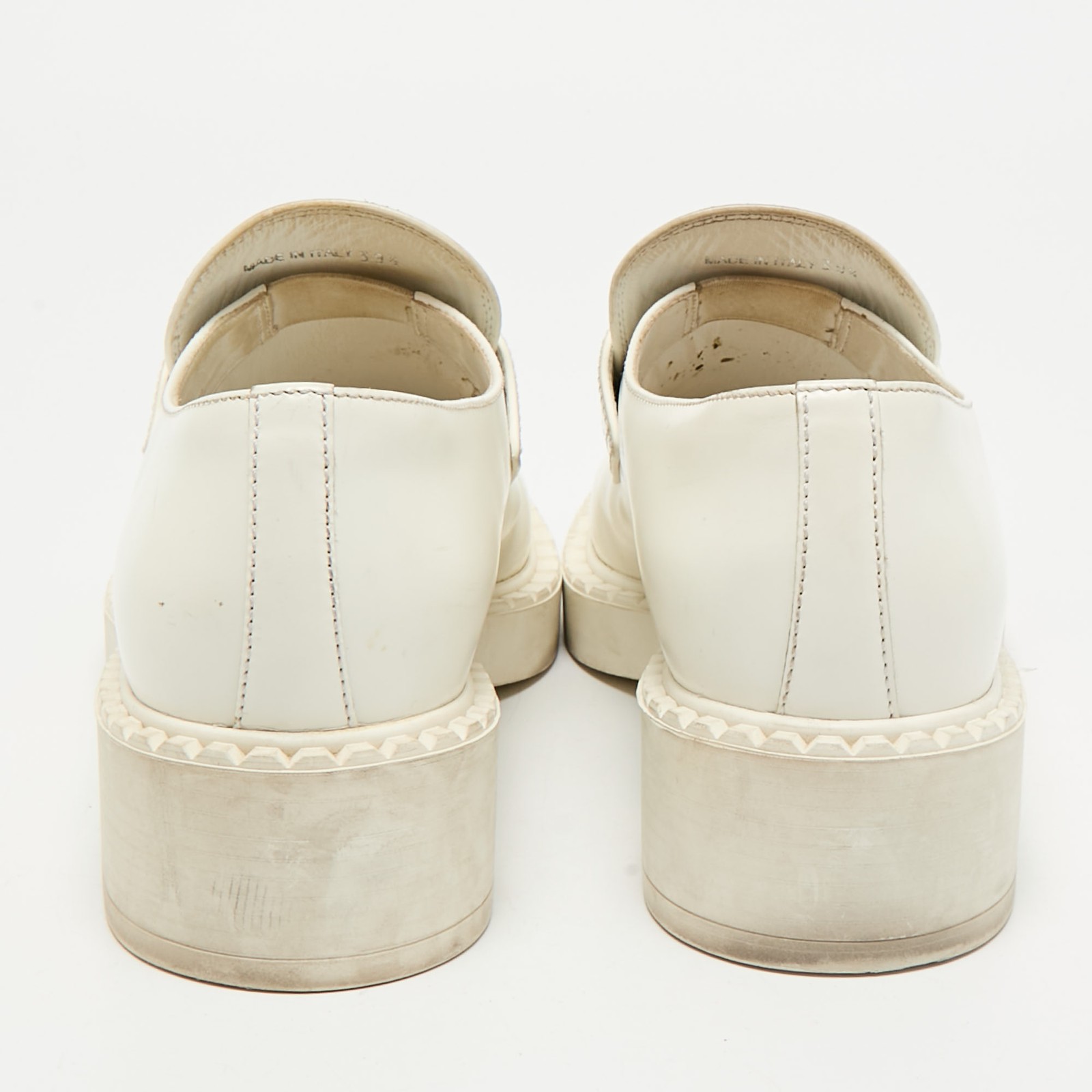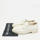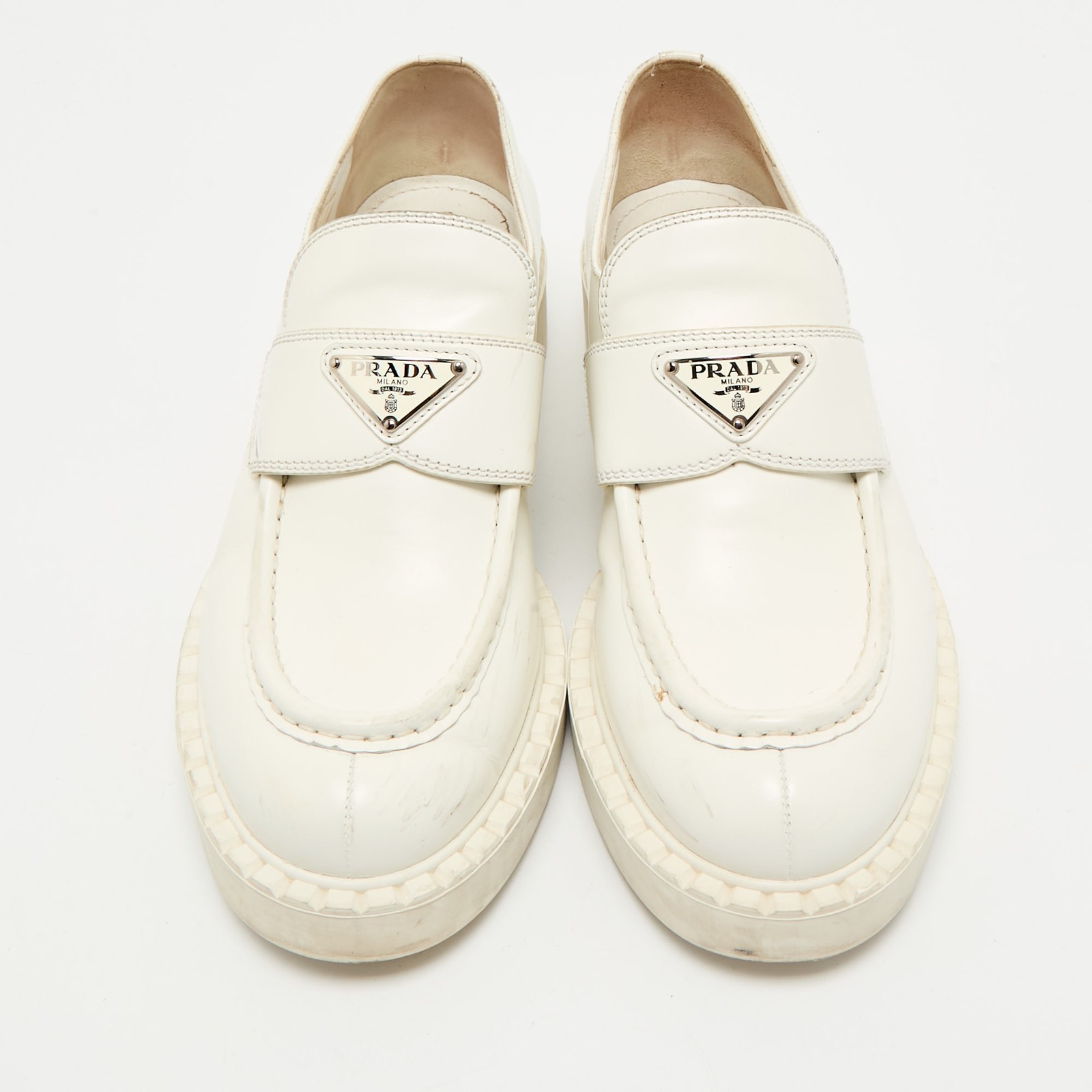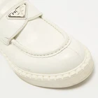 Minimalist yet unmistakably Prada, these white leather loafers are accented with a sleek logo plaque for a polished finish. Slip on convenience meets sophisticated design and is ideal for those who appreciate understated modernity.Certified by The Luxury Closet - This item has gone through a detailed authentication process overseen by our experts. We offer a lifetime guarantee of authenticity on all our items. Import duties, taxes and charges are not included in the item price. These charges are the buyers responsibility. Please check with your country’s customs office to determine what these additional cost will be prior to buying. Our eBay Store About Us Contact Us Add to Favorite Sellers Prada White Leather Logo Plaque Slip On Loafers Size 39.5 $852.5 Minimalist yet unmistakably Prada, these white leather loafers are accented with a sleek logo plaque for a polished finish. Slip on convenience meets sophisticated design and is ideal for those who appreciate understated modernity. Product Details Brand Color White Dimensions Material Leather Size 39.5 Outsole Width Outsole Length Heel Height Includes Certified by The Luxury Closet This item has gone through a detailed authentication process overseen by our experts. We offer a lifetime guarantee of authenticity on all our items. How We Check The in-house team of experts at The Luxury Closet is highly trained to verify the authenticity and the condition of the luxury products. They ensure that only 100% authentic items are put on sale.The evaluation process is unique with its own mix of assessment criteria and differs according to the category. Each item is evaluated based on the following combination of hallmarks, hardware, stitching, symmetry, material, craftsmanship, stamping, codes, hologram stickers, and packaging. Our authenticators also check if the items have been modified or amended (e.g., aftermarket diamonds, replaced batteries, repaired bags, etc.) International Buyers Import duties, taxes and charges are not included in the item price. These charges are the buyers responsibility. Please check with your country’s customs office to determine what these additional cost will be prior to buying.