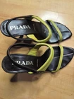 The product is a pair of Prada women's brown and green leather high heels in size 37 (EU) or 6.5-7 (US). These stiletto heels are designed as pumps with a leather upper, lining, and outsole. The shoe has a medium width and is suitable for summer, fall, and spring seasons. This stylish and elegant pair of heels exudes luxury and sophistication, perfect for any fashion-forward woman looking to add a touch of glamour to her outfit.
