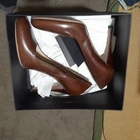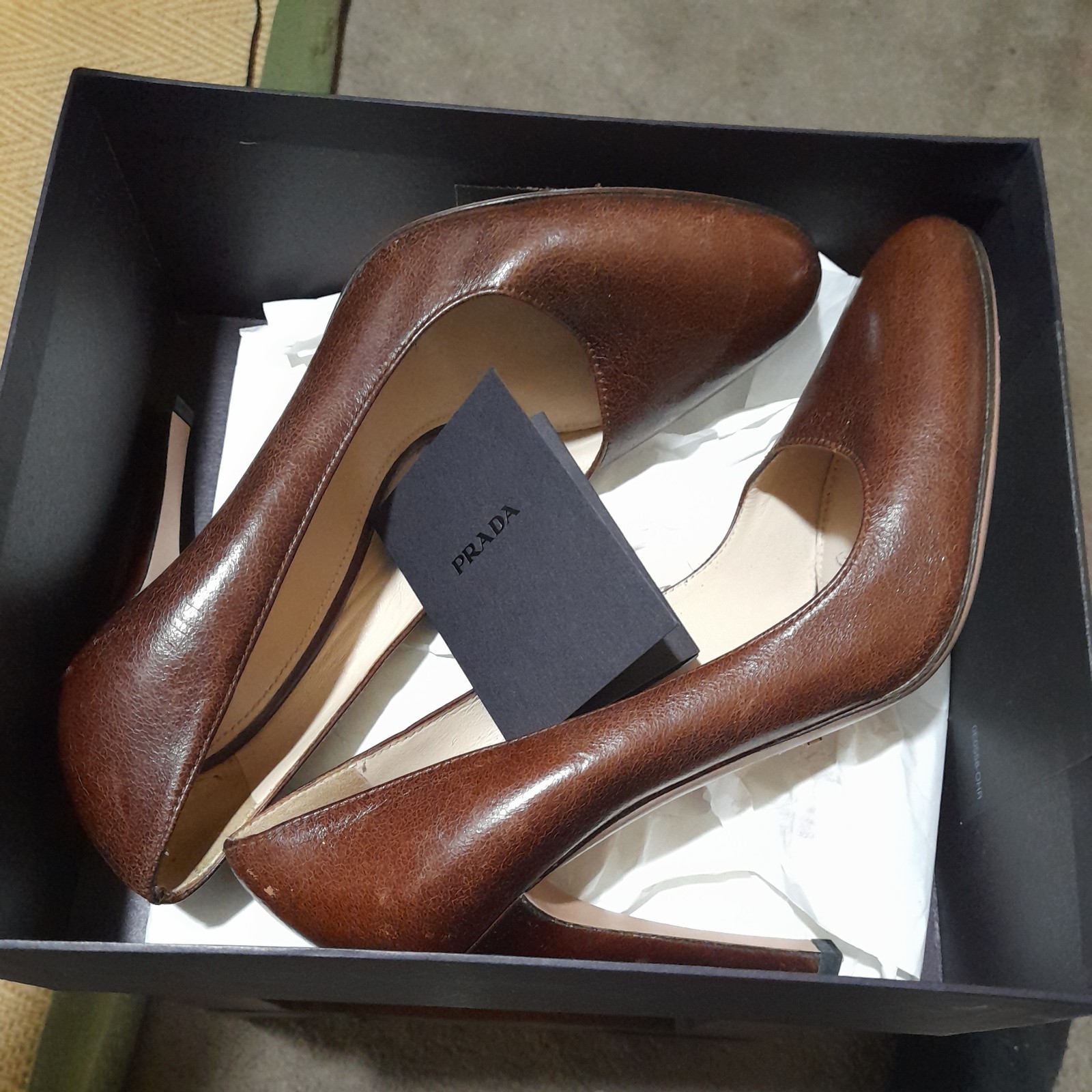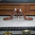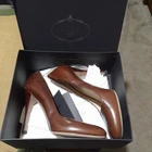 Crafted in Italy with meticulous attention to detail, these Prada women's leather pumps are the epitome of sophisticated style. With their rich brown hue and timeless solid pattern, they are versatile enough for a variety of occasions. The stiletto heels add a touch of glamour and elegance, ideal for those looking to make a statement. In a size 36 (UK 3.5, US 5.5, EU 36), these pumps feature a closed toe design that ensures a sleek look while offering comfort for everyday wear. They are perfect for anyone who appreciates high-end fashion with a nod to the chic aesthetics of the 90s. Whether stepping into the office or out for an evening event, these shoes are a confident choice for any wardrobe. brown box