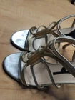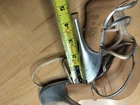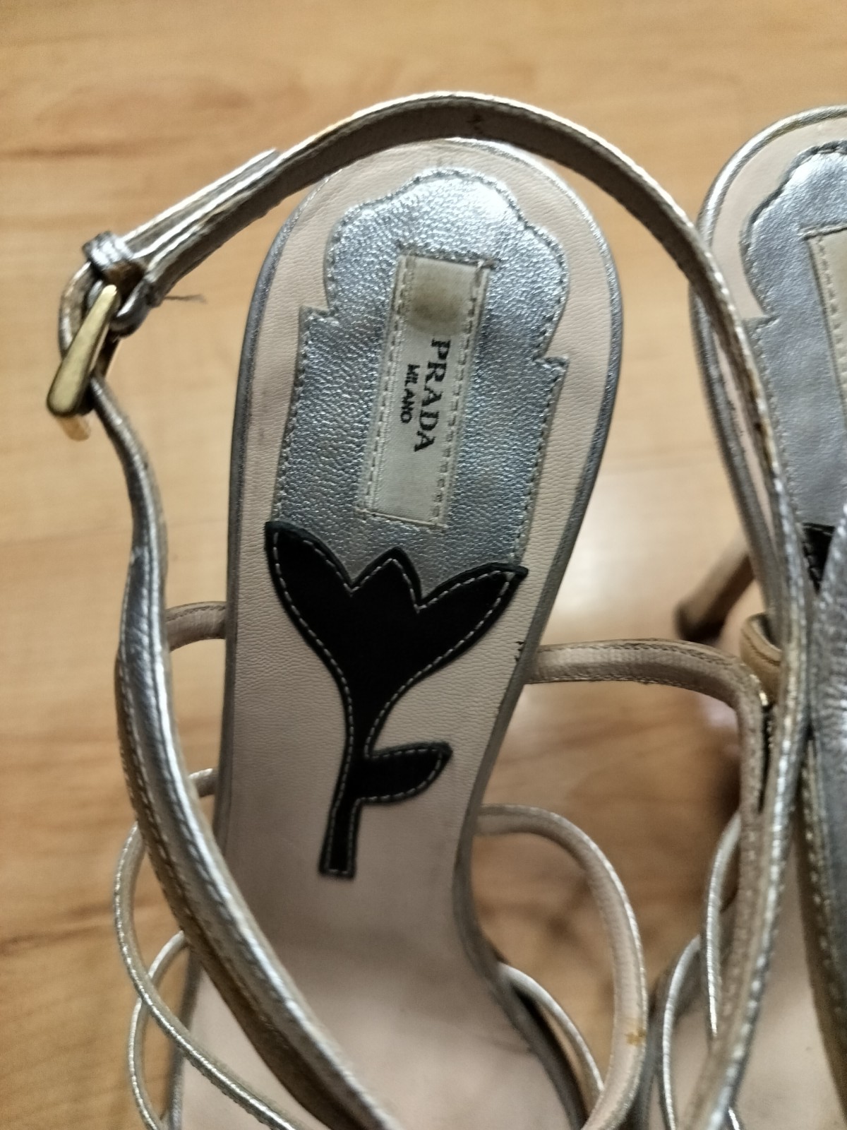 This product is a pair of Prada Women's Gold and Silver Strap High Heels Sandals in size 38 (EU) or 7 (US). The sandals feature a stiletto heel, strappy design, and are crafted with leather and suede materials. The outsole is made of cork, providing both style and comfort. Perfect for adding a touch of elegance to any outfit, these sandals are a statement piece for any fashion-forward woman. Made in the USA, these heels are a luxurious addition to any wardrobe.
