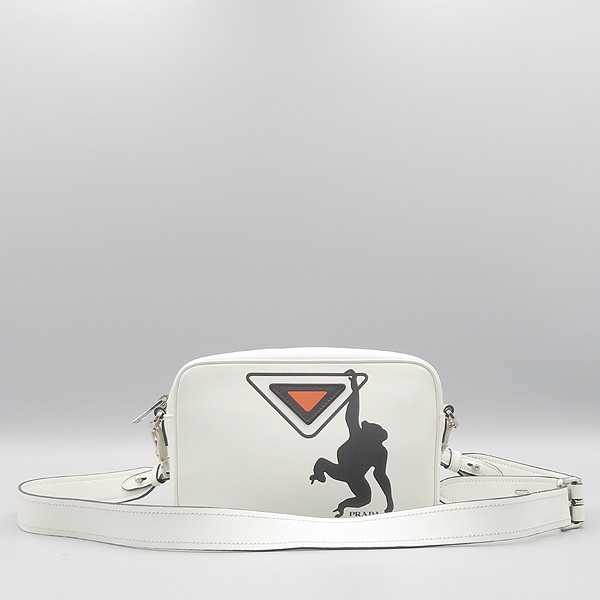Size: 22 cm width/ 14 cm/ width 8 cm/ strap height ~60 cm Color: Black Accessories: Guarantee card/booklet Prada (Prada) 1BH093 white calf leather monkey printing camera crossbody bag [Gangnam Main Store]. The material is leather. There is a zipper pocket on the inside. **Due to the nature of second-hand luxury goods, there may be stains not visible in the image. **