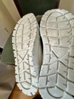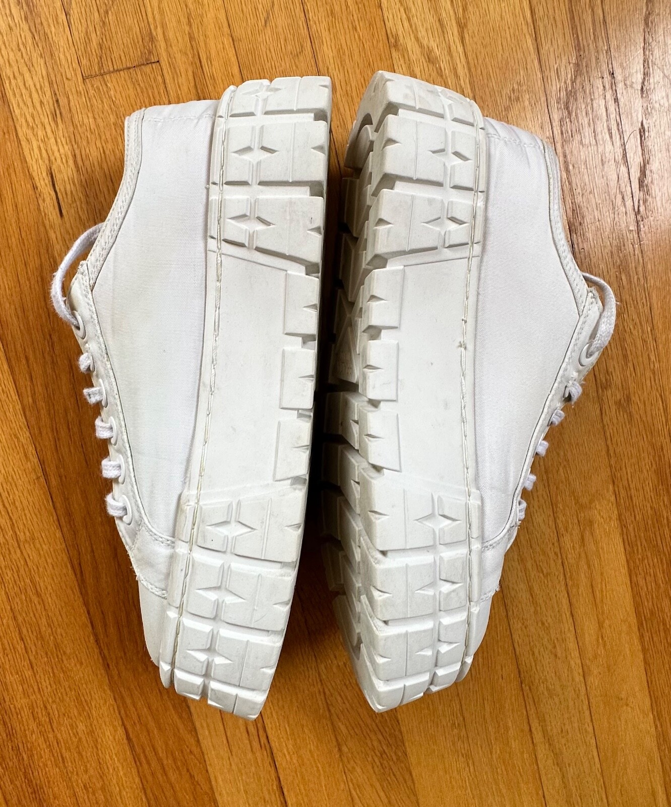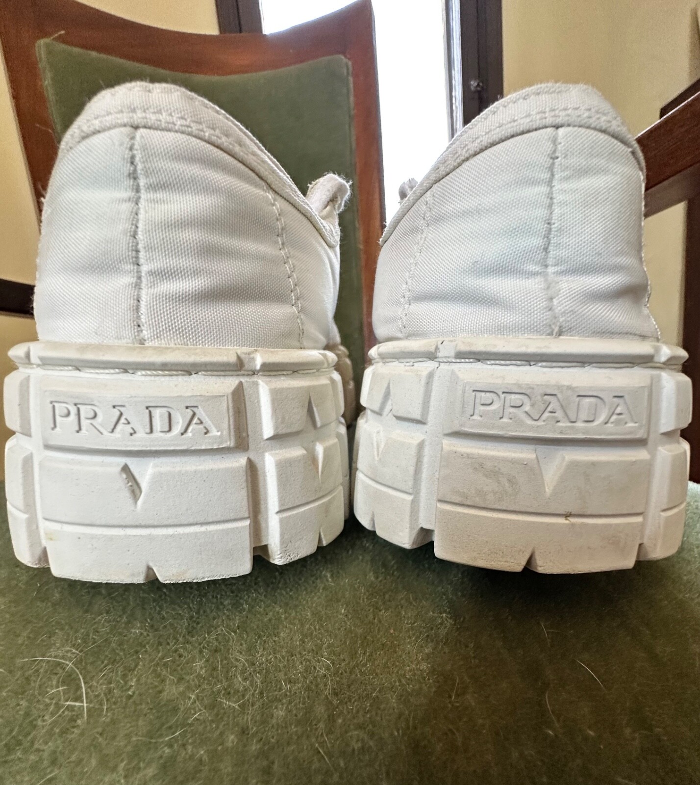 These fabric sneakers with a sporty design have a platform sole . The embossed rubber triangle logo is missing on the side of the left shoe. The fabric has staining. The inside logo has wear. Please look at photos ! :). Leather lining-- One Embossed rubber triangle logo Rubber flatform sole, height 50 mm Tread with geometric pattern Removable leather-covered insole Imported Orig: $1,050 • • $250.00