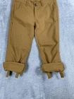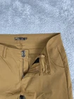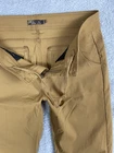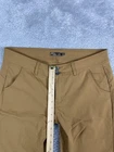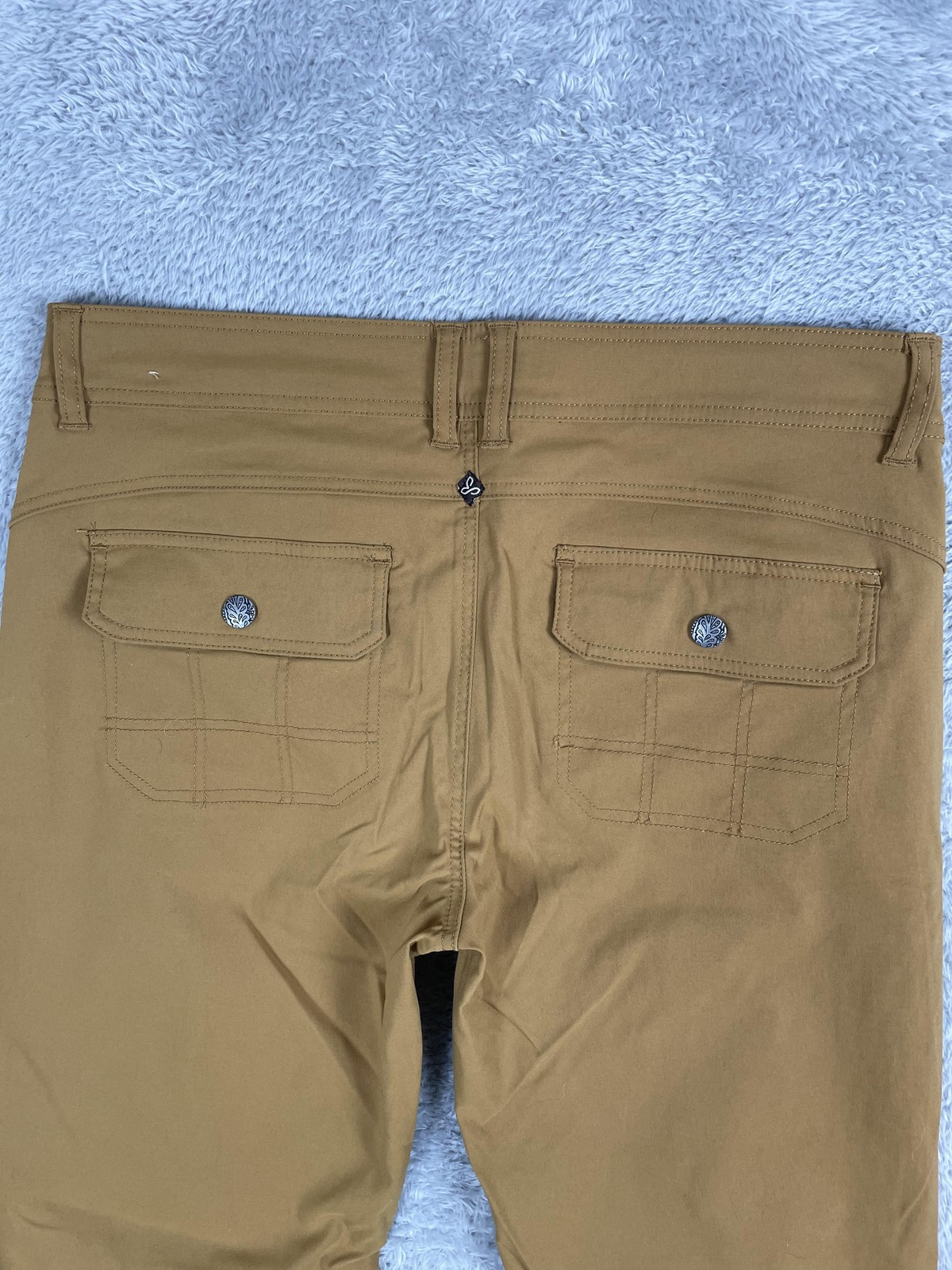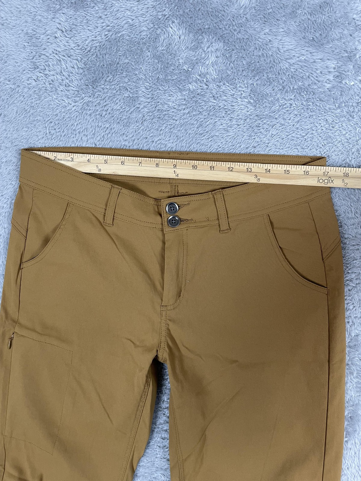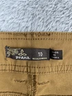 Brand: prAna Style: Halle womens outdoor hiking pants with regular inseam and roll-up leg tabs. Color: Brown/tan. Size on tag: 10 (Regular Inseam). Materials: 97% nylon, 3% elastane; made in China. Style/Model code: STYLE# W4HARG113; PO# 17290-00. Details: Double button waistband with zip fly, belt loops, front hand pockets, right leg zip pocket, rear flap button pockets with button closures, articulated knees, and roll-up cuffs with interior button tabs to convert to capri length, ideal for hiking and outdoor activities.