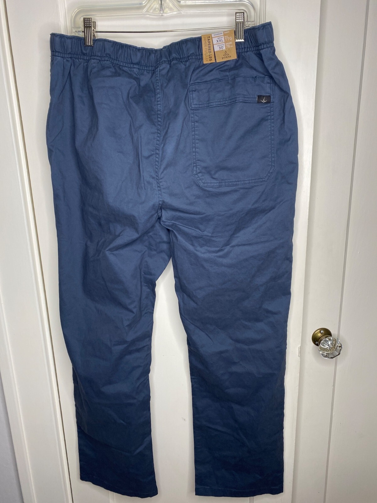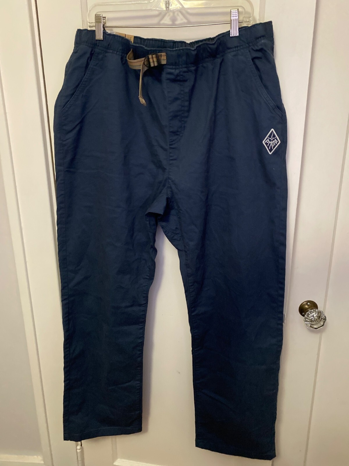 Features of the Prana Mojave Pant Organic cotton stretch blend fine twill Unisex Style Front slash pockets Elastic waistband Pull-on elastic waistband with adjustable Heritage jacquard webbing Back right patch pocket with flap Inseam gusset Heritage woven label at back pocket Heritage patch at front left Fabric Details 97% Organic Cotton, 3% Elastane. Size: Mens XXL Condition: New With Tags