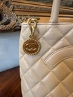 Beautiful Vintage Chanel Caviar Leather Medallion Tote Gold hardware. Gold plated zipper pull. Some signs of wear on corners. Interior is clean and so smells. The interior pockets and the exterior pocket are all clean. Approximately 11 1/2"W x 9 1/2"H x 6"D Strap drop approximately 6 1/2” The hologram is in tact. Made between 1997-99. Comes with a Entrupy certificate of authenticity. If you need additional photos please let me know. Please view all photos as they are part of the description. Price includes priority shipping with additional insurance to cover the value.