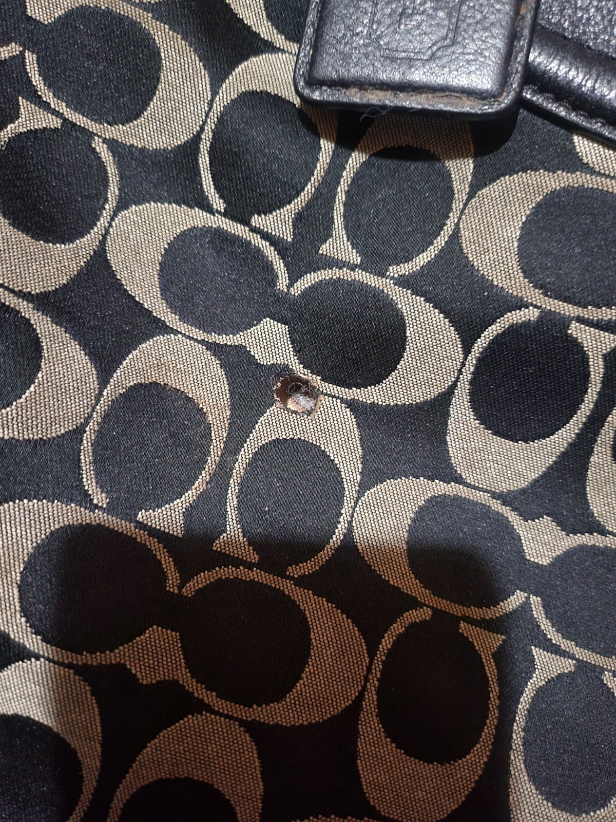 This women's Coach handbag is a stylish addition to any wardrobe. Crafted with quality materials and designed with attention to detail, this bag is perfect for the fashion-conscious woman on-the-go. The brand's reputation for excellence in handbag design is evident in the bag's sleek lines, spacious interior, and durable construction. The bag is perfect for everyday use, with its ample space for books, wallet, and keys. The interior features a zippered pocket for added security, while the exterior boasts the Coach logo and a convenient slip pocket. This bag is a must-have for any woman who values both style and function. In used condition, small burn hole (see second photo)