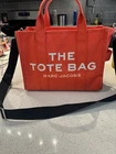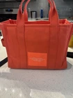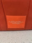 This large Marc Jacobs tote bag is designed for women and features a square shape in vibrant orange nylon. Ideal for travel, casual outings, and business use, it includes a crossbody strap for convenient carrying. The designer bag boasts inner pockets, adjustable strap, and exterior pockets for organization, with a stylish strap accent adding a unique touch. Perfect for those seeking a spacious and fashionable accessory for various occasions.