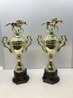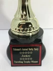 TROPHY FEATURES: PREAKNESSS STAKES / HORSE RACING PARTY AWARD!! BEST DRESSED LADY, GENT, COUPLE FIRST PLACE HORSE PICKER! TRAVELING TROPHY ETC.! TROPHY IS 14” “ TALL HEAVY RESIN *FREE CUSTOM ENGRAVING!* With felt bottom bump, foot pads to protect and prevent scratching furniture, table tops, etc. Custom Engraved 1.5"x 2.25" Black Brass Nameplate with Red Backing Plate! ATTENTION PLEASE! We do real diamond cutter engraving Not on plastic or laminate! This nameplate is black brass ! ALL ENGRAVING IS FREE! PLEASE VIEW MY FEEDBACK! During eBay checkout, on the view your purchase page, click on the message to seller area to add your personalization information you want engraved. PLEASE PUT the exact name/names And all text you want on each line of the engraved nameplate. (please double check the spelling) Thank You! Please # the lines! Here is a sample 1 st line THE MAGIC HATS 2 nd line 2011 3 rd line 8 BALL CHAMPIONS I am a Disabled American Veteran. I have been self employed and producing licensed sports plaques in New England since 1990. The quality of our product and workmanship are unsurpassed. If you would like a custom plaque made, or have any questions please email anytime. God Bless America, John For more sports plaques and memorabilia please view our other auctions. eBay - MRVITO34 eBay store Jva Sports Plaques Thank you and good luck! PLEASE DO NOT JUDGE TROPHIES BY SCAN. WE SHIP SEVEN DAYS A WEEK! ALL ORDERS RECIEVED BY NOON SHIP SAME DAY! WE SHIP 7 DAYS A WEEK! ALL ORDERS RECEIVED BY 12 NOON SHIP SAME DAY!