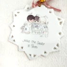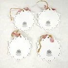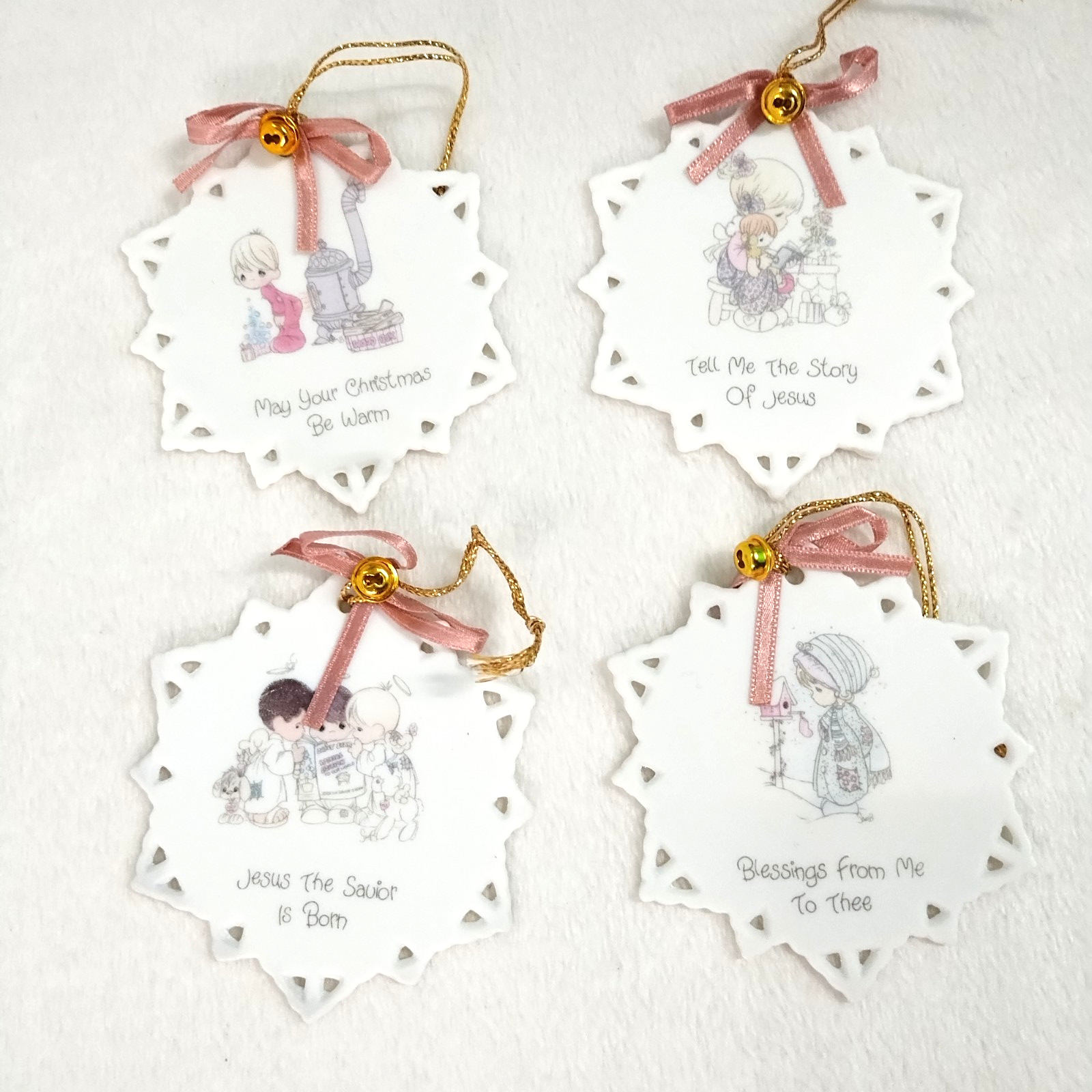 The Precious Moments Snowflake Christmas Ornaments set includes four vintage 1990 ornaments, each shaped like snowflakes and measuring approximately 3 inches in size. These white porcelain ornaments feature an all-over snowflake pattern and come boxed for easy gifting or storage. Part of the Precious Moments ornaments are designed for hanging and are a charming addition to any holiday decor collection, specifically tailored for women and suitable for recipients over 12 years old.