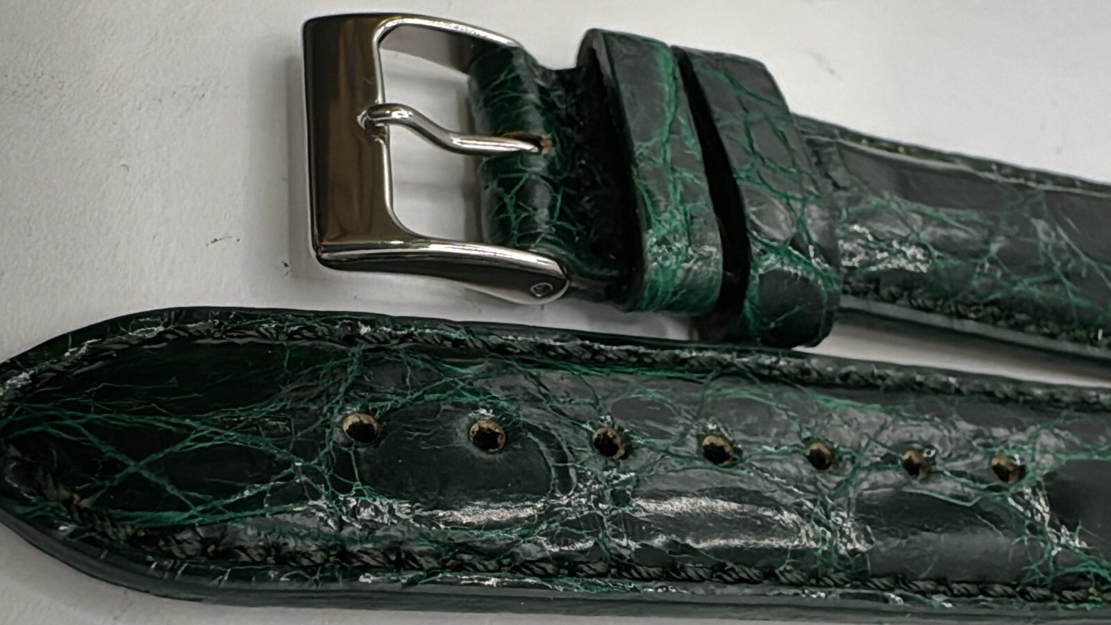 Pregiato cinturino vero coccodrillo mm20/18 verde scuro handmade in Italy imbottito mm20 attacco cassa, mm18 fibbia. Quest'ultima a scelta inox, gialla, rosè (segnalare la preferenza) Il cinturino potrà su richiesta essere marcato con il logo dei maggiori brand (non c'è sovrapprezzo) Lunghezza standard 11.5x7.5cm; imbottitura 5-3.5mm Fornito con anse per il montaggio