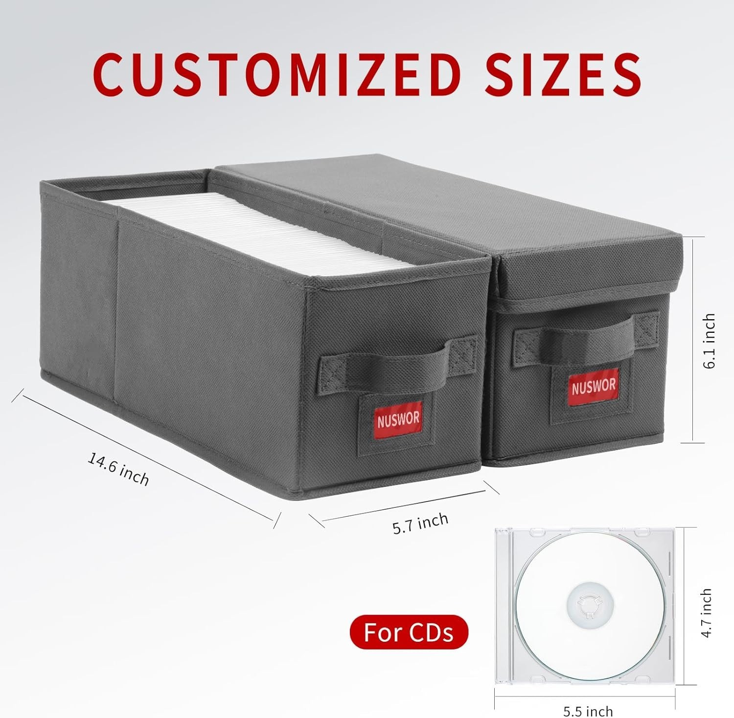 Premium CD Storage Box - Stackable CD Organizer Box with Lid - Holds 70 Jewel Cases - 14.37 x 5.5 x 6.3 inches - 2 Pack - Grey 【Versatile CD Storage】Unclutter your scattered CD collections and keep your space tidy with our smart CD storage boxes. Designed to hold up to 35 jewel-case, 70 slim-case, or 200 CDs in sleeves, it's a real lifesaver for CD enthusiasts! 【Stackable and Space-Saving Design】Our CD storage boxes have a dimension of 14.37x5.7x6.3 inches, perfect for stacking and maximizing your storage space. Say goodbye to messy spaces and hello to an organized lifestyle! 【Stackable and Space-Saving Design】Our CD storage boxes have a dimension of 14.37x5.7x6.3 inches, perfect for stacking and maximizing your storage space. Say goodbye to messy spaces and hello to an organized lifestyle! 【Protective CD Storage】Features lids to keep dust and scratches away. Our CD box storage has been meticulously designed to keep your CDs, DVDs, and tapes in mint condition. 【Convenient CD Storage Shelves Alternative】Fed up with bulky CD shelves? Try our compact and lightweight CD case organizer. It's a perfect combination of convenience, space-efficiency, and visual appeal!