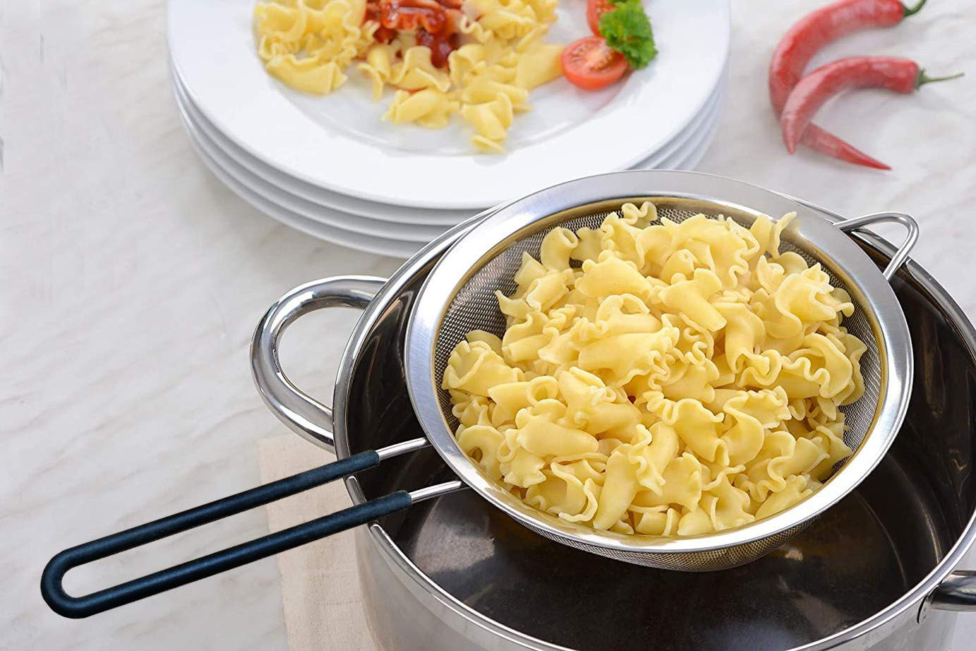 NewlineNY Stainless Steel Premium Mesh Strainers 2 pcs set, one 5" and one 8 inches Diameter, 2 sizes set. Strainer Sizes (LxWxH) : Small 18 x 8 x 2" & Large 12 x 5 x 1.6" HEAT RESISTANT, COMFORTABLE SILICON HANDLE: Our “WE-CARE” comfy soft-touch anti-slip silicone-coated handle, provides excellent sturdy grip, allow you to strain food easily while maintaining control in slippery conditions, and most importantly protecting your hands from burns. NEVER STRUGGLE WITH SLIPPERY or HOT HANDLES AGAIN! Double Stainless Steel: Sturdy and built for last, Easy for cleaning & dishwasher safe. EASY STORAGE with the nested design and loop handle. Hang them together or store them conveniently in a drawer! NO MORE WASTED GRAIN – Rice, Quinoa or similar grains will be easily strained with our state-of-art heavy duty fine wire mesh.