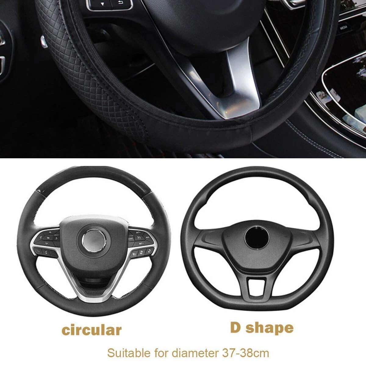product Shipping Payment Warranty and Guarantee Other Policies Item Description ✅Specifications Color:Black Material: PU leather Style: double round pattern with elastic steering wheel cover Applicable models: General Applicable steering wheel size: 37-38cm (15 inches diameter) Applicable season: four seasons universal Features: stylish and portable, easy to change Product size: 38*38*4cm (unfolded size) ✅How to install: Put the steering wheel cover on the top of steering wheel Pull tight the steering wheel cover from top to side Keep pulling tight the steering wheel cover from side to bottom Fix the bottom of steering wheel cover and adjust it. Done ✅Note: Please allow 1-3 cm difference due to manual measurement. Due to light and screen difference, the item's color may be slightly different from the pictures ✅Package Included: 1* Steering wheel cover Item Pictures More Shipping 1.We ship to worldwide,except Hong Kong,Taiwan,Macao,China,Guemsey and we do not ship to APO/FPO, etc. 2.Item will be shipped within 3 business day on payment received. 3.Items are shipped from China using Airmail,reach most of countries within 10-20 business days. 4.sDelivery time depends on destination and other factors,it may takes up to 20 business days. Payment 1.We accept Paypal only. 2.All major credit cards are accepted through secure payment processor PayPal. 3.Payment must be received with 7 days of auction closing 4.If you have bought multiple items from us,you can send us one payment for all the items instead of paying for them individually. When you click the Pay Now button,eBay will automatically determine if there are other items you have won of purchased from us and will combine them for your review. Warranty and Guarantee 1.One year warranty!30 days money back!Buy with confidence! 2.If you are not satisfied when you receive your item,please return it within 30 days for a replacement or money back.Please contact us before you return the item. 3.If item is defective in 3 months,we will send you a replacement without extra charger,or offer refund after we receive the defective item. 4.If item is defective after 3 months,you can still send it back to us.We will send you a new one after after receiving the defective item,but you have to pay the extra shipping fee. Other Policies 1.We are not responsible for any custom duty or import tax. 2.We will leave Positive Feedback after receiving the payment.Please contact us if you are not satisfied with the item after receiving it. 3.All emails will be answered within 1 business day.If you do not receive our reply,please kindly re-sent your email and we will reply you as soon as possible. 4.Serious Buyer Only!Please place bid only if you agree with all the terms.