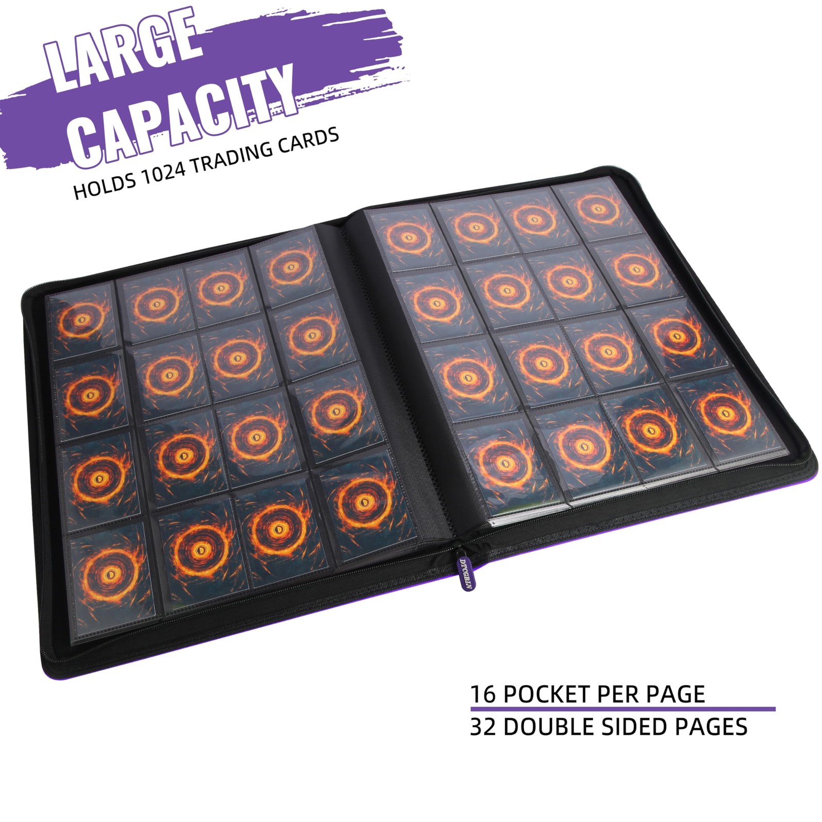 Multi-PocketThe trading card binder features16 pockets, allowing for a maximum capacity of 1024 cards. The 16-pocket design enables you to quickly flip through and find the specific card you are looking for, eliminating the hassle of flipping through multiple pages.Side LoadingThis design prevents additional pressure or friction on the edges of your cards, reducing the risk of edge damage. It allows for easy browsing and flipping of cards, making card management quicker and more convenient.Acid-Free PagesProtect cards from damage caused by acidic materials. These acid-free pages are transparent, allowing for clear display of the cards. This enables you to easily appreciate, showcase, and share your card collection, enhancing its display effect and visual appeal.With PaddingThe padding design of the inner pages uses soft materials to provide additional cushioning and protection for cards. It has a stylish and professional appearance, suitable for showcasing cards to others or for use in professional environments.Gift SelectionWhether it is birthday, Children's Day, Christmas, or the school season, it can be rewarded as a gift to dear children or your friends investment card collectors Large Capacity - Multi-Pocket:Card Binder can holds up to 1024 trading cards and comes with 32 double-sided 16-pocket, Provides plenty of space to keep all your cards organized not disorganized,Conveniently show your precious collections to your friends. Meticulously Designed—Multiple Layers of Protection: The binder features a fixed lining design, with each page having padding to prevent bending and protect the cards from being crushed. With its ringless design, you no longer have to worry about the rings causing damage to your collection,High quality zippers can safely protect your trading card from accidental drop or accidental damage during shipping. Side-Loading - Easy Access: Trading card binder Side Loading Design Prevents Cards from Falling Out allows for easy browsing and flipping of cards, making card management quicker and more convenient,The edges of the cards are not subjected to extra pressure or friction, reducing the risk of edge damage. Safe Materials - Use With Peace Of Mind: This premium card binder is made of high-quality PU leather material,durable,waterproof,dust-proof,and moisture resistance and easy cleaning. Card sleeves are made of archival-safe, acid-free non-PVC material to protect your cards from fading and staining. Multi-Compatible - Multi-Choice: Professionally designed, Pocket size 2.7x 3.8 in ,compatible with a variety of standard cards , such as baseball, soccer, basketball, football, PKM, Yu-Gi-Oh! , Star Wars X-Wing, Force of Will, Card fight Vanguard, World of Warcraft, Panini XL & Match, Dragon Ball Z, and many more.