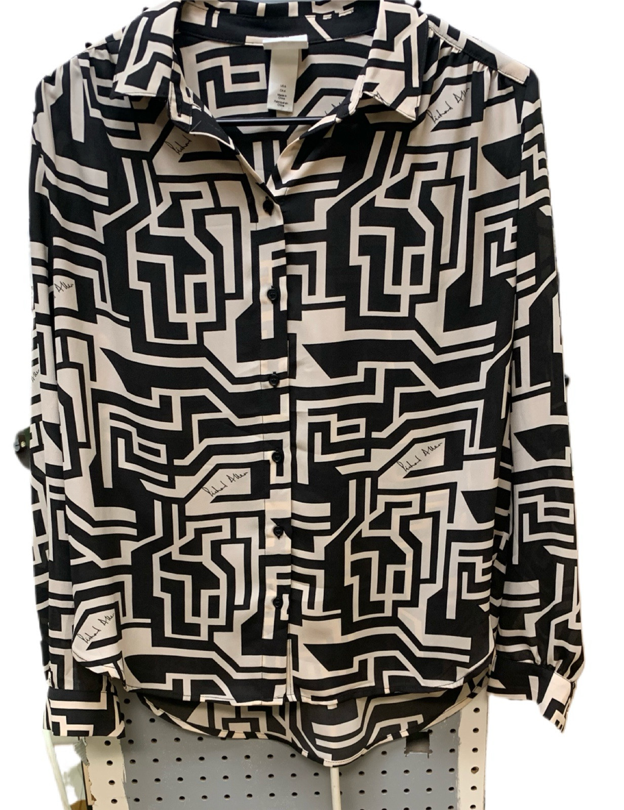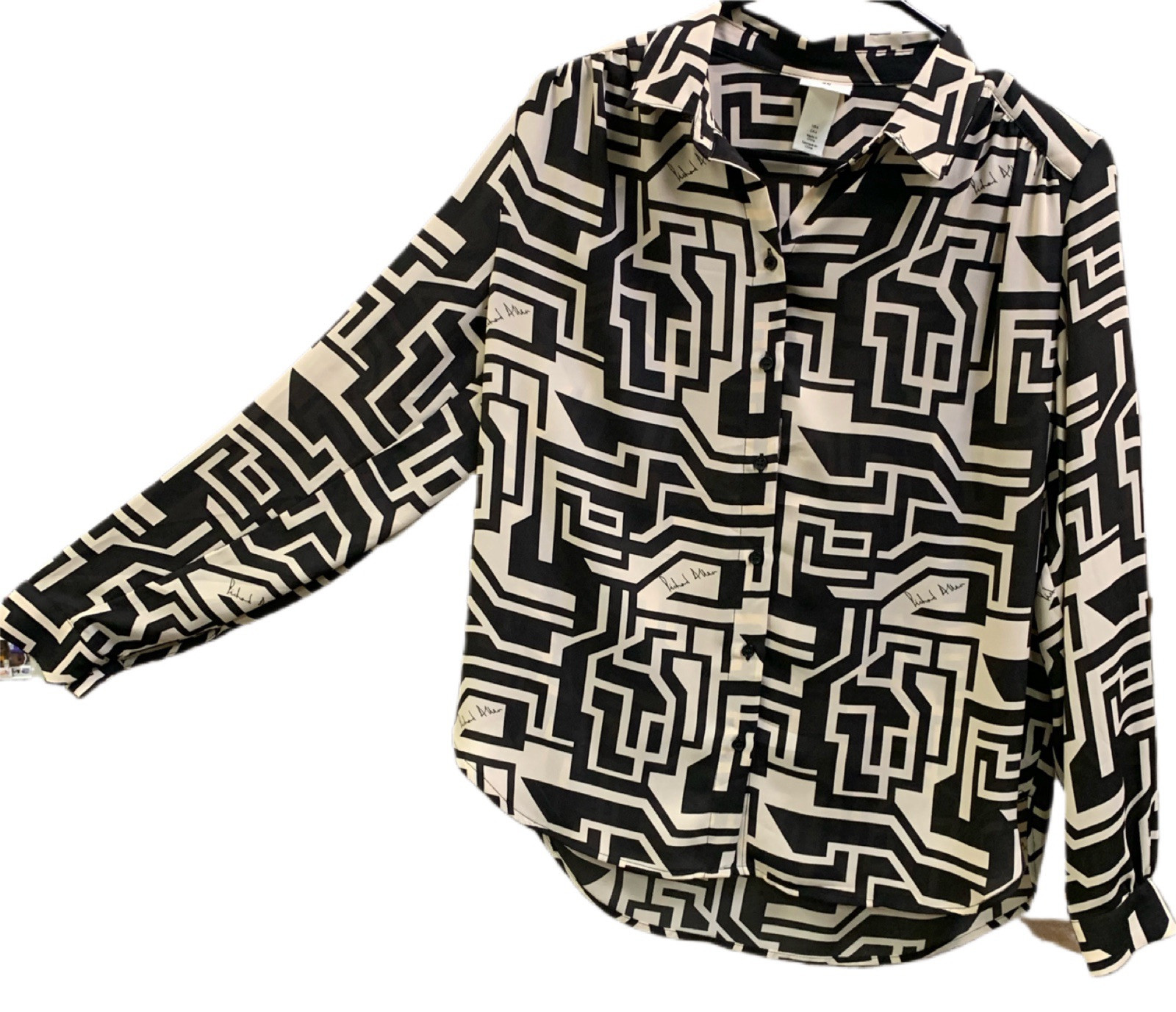 This is a pre-owned women's blouse from H&M in size 6, featuring a geometric pattern designed by Richard Allen. It is a stylish and modern piece that would be a great addition to any woman's wardrobe. All measurements are approximate with item resting. Back Collar Bottom 27” Pit to Pit 22” Shoulder to Cuff 22.5” The item is thoroughly washed/cleaned as per the manufacturer's guidelines before shipment. See my other listings for more stuff you didn’t know you needed.