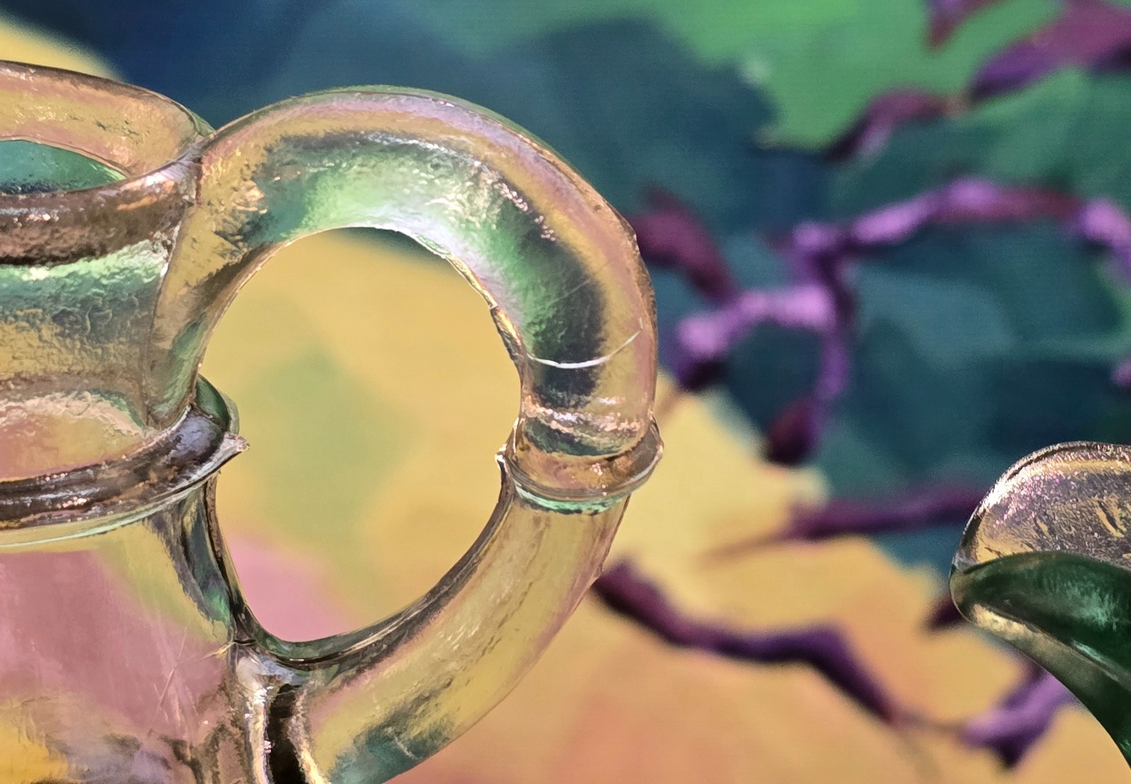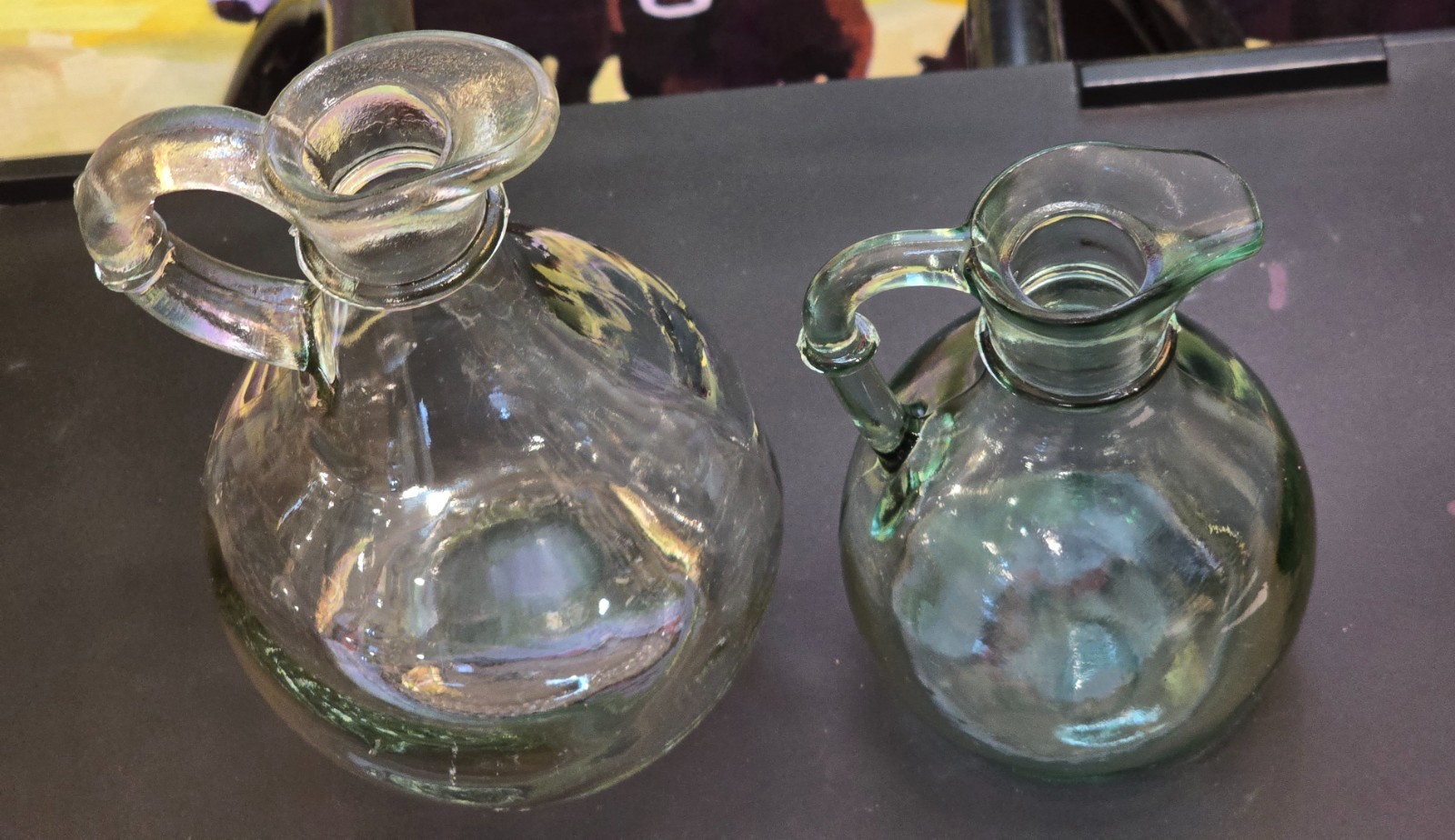 This listing features a pair of vintage glass oil vinegar cruets, measuring 5.5" and 4" in height. The cruets are unmarked and hand-blown, showcasing a unique production technique. With a combination of clear and green glass colors, these elegant pieces add a touch of vintage charm to any dining table or kitchen decor. Perfect for serving oils or vinegars, these cruets exude a timeless elegance and functional aesthetic.