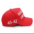 Show off your patriotic side with this President Donald Trump 45-47 2024 Make America Great Again MAGA Red baseball cap. The cap is made of lightweight and breathable cotton fabric, making it perfect for casual occasions. The adjustable size ensures a comfortable fit for all head sizes. The cap features a solid red color with an American flag logo, making it a great addition to any patriotic outfit. It is perfect for showing support for President Donald Trump and his Make America Great Again campaign. This cap is a must-have for any American who wants to show off their patriotism.
