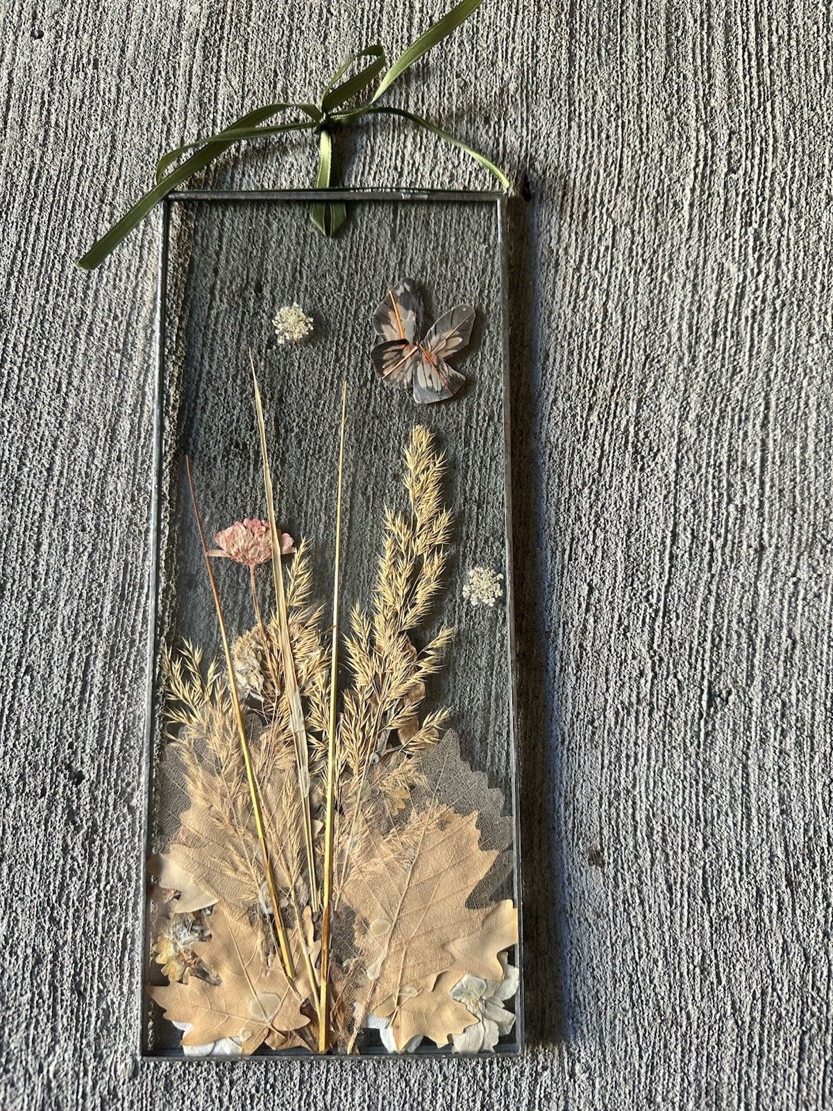 Beautiful 5x12 pressed flower wall art featuring a Monarch butterfly and colorful dried florals, displayed in a clear glass frame with ribbon for hanging. A unique piece of botanical décor perfect for nature lovers, boho interiors, or gift giving. ✨ Details: • Size: 5x12 inches • Frame: Glass with metal edging & ribbon hanger • Features: Pressed dried flowers, butterfly, natural arrangement • Style: Botanical, Cottagecore, Boho Chic • Condition: Excellent, ready to display This handmade-style floral artwork adds a natural, timeless charm to any wall