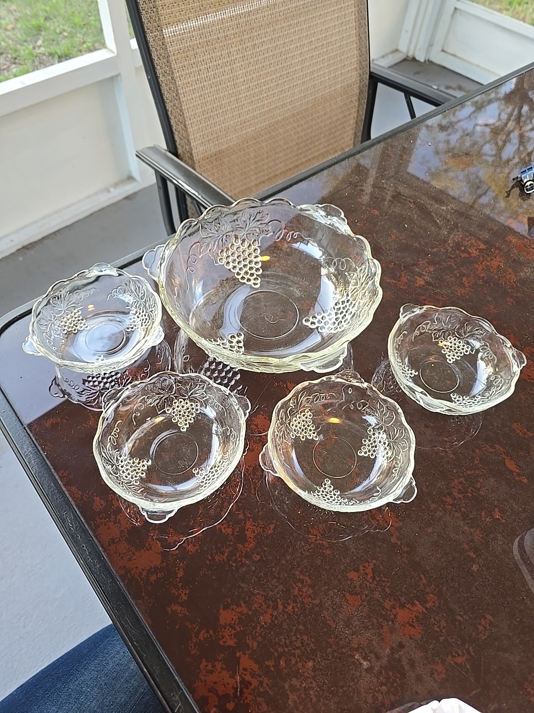 Absolutely love this set! The grape motif adds a charming vintage touch, and the scalloped edges give it such elegance. The bowls are sturdy, clear, and flawless—no chips or cracks. Perfect for serving snacks, salads, or even as decorative pieces. The size variety is super handy, and they stack neatly. Great value for a set of five! Would definitely buy again.