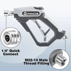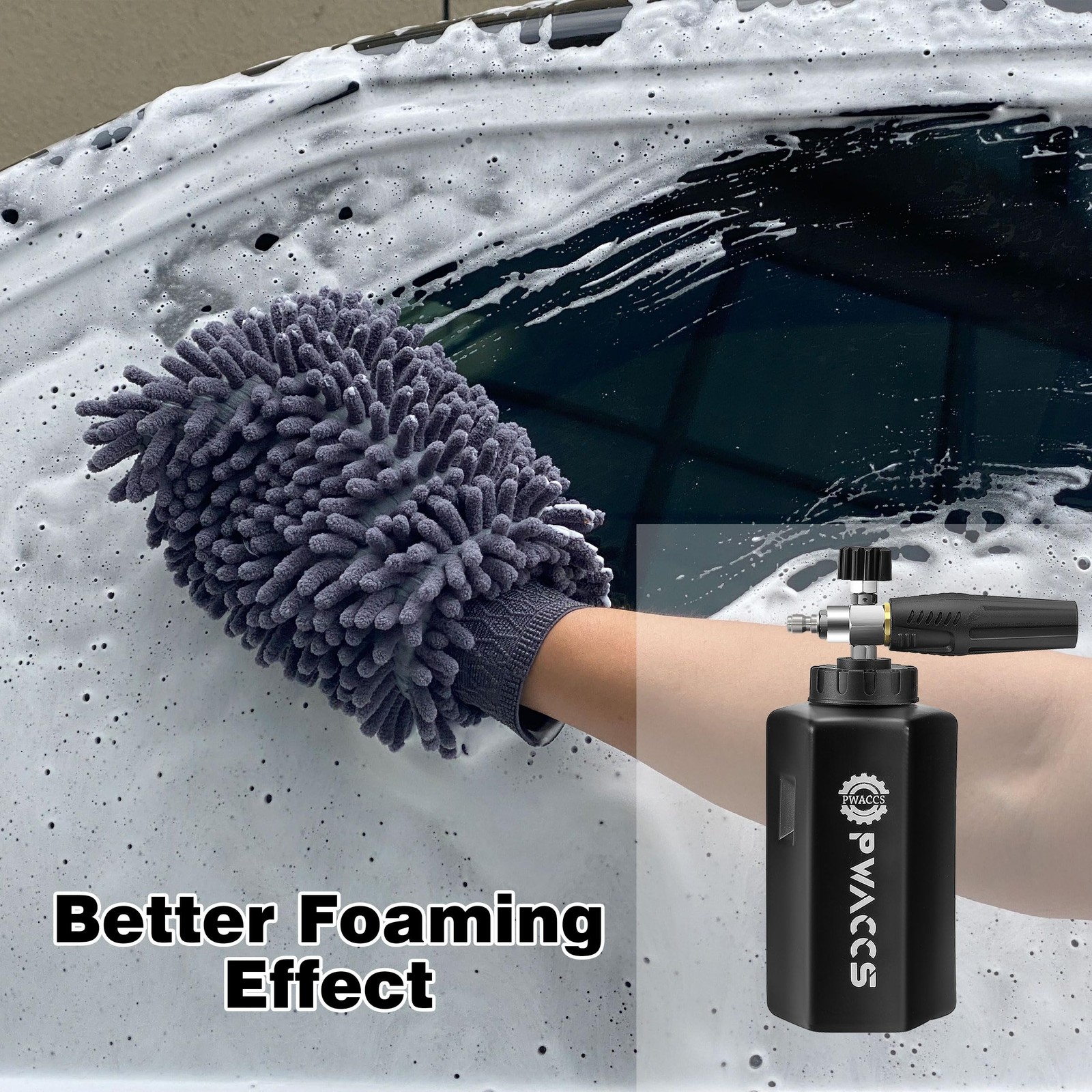 Foaming Cannon with Handle Gun for Power Washing, Heavy Duty Foam Blaster Big Mouth Adjustable Snow Foam Lance Pressure Washer Accessories. Say goodbye to frustrating hose tangles and limited maneuverability. Car wash cannon foam blaster features an ergonomic design and lightweight construction. The easy-pull trigger reduces hand fatigue, allowing you to clean for extended periods without discomfort. Experience a comfortable grip that enhances your cleaning efficiency. With a maximum pressure rating of 4,000 PSI, car washer foam gun packs a punch. Whether you're tackling heavy-duty industrial cleaning or residential tasks, this gun delivers the power you need for a thorough clean every time. Professional-Grade Performance: Elevate your cleaning game with a pressure washer spray gun attachment that delivers professional-level performance. Perfect for commercial and residential use. Clean your car, patio, driveway, or siding effortlessly. How do I increase the amount of foam? Adjustable nozzle for accurate mixing and foam generation. Turn the top knob right (-) to get the thickest mixture, adjust the nozzle to get a proper sprinkle pattern, and let it loose. Reduced Risk of Scratching: Foam cannons gently apply soap to the car's surface, reducing the risk of scratching the paint and leaving swirl marks.Time-Saving: Foam cannons make car washing faster and more efficient, reducing the amount of time and effort required for cleaning. Description: Material: Stainless Steel Bottle Capacity: 1.5 Liter/0.33 Gallon Fitting: M22-14mm Max Working Pressure: 4000 PSI Max flow rate: 8 GPM Max Temperature: 60℃ / 140 ℉ Package Included: 1 x 1.5 Liter Foam Cannon 1 x Pressure Washer Short Gun 1 X Foam Maker 1 X Stainless Steel Spray Core 1 X Grey Cleaning Rag DENSE & THICK FOAM - The heavy-duty foam core of the pressure washer foam cannon creates a snow-like foam that clings to the car's surface. Effortlessly remove dirt and grime from your vehicle. Achieve professional-level cleaning results with a specially designed foam cannon kit. HIGH-PRESSURE GUN - pressure washer short gun kit features an M22-14mm fitting. Max working pressure is 4000 PSI. A new handle structure is designed to reduce the arm's burden when using the foam gun. MATERIAL UPGRADE - Pressure washer car wash kit is made of high-quality stainless steel material, which is strong and durable. The wide-neck foam blaster 1.5 Liter is equipped with a stainless steel filter, which ensures a leak-proof seal. ADJUSTABLE FOAM SPRAYER - The adjustable nozzle ensures the ideal spray pattern, while the water regulator knob controls water and foam mix. The nozzle holder rotates 360 degrees to tweak the direction. Snow foam cannon makes car washing faster, reducing the amount of time and effort required for cleaning. GREAT COMPATIBILITY - The universal power washer foam gun is compatible with M22-14mm fittings, compatible with most high-pressure washer models. PLEASE NOTE: The foam gun cannot be connected to garden hose, ordinary water pipe, or faucet. MULTIPLE USE - Big-mouth pressure washer foam gun is perfect for cleaning cars, roofs, driveways, siding, floors, windows, trucks, and SUVs. Whether you are a professional cleaner or a homeowner looking to clean your house, our snow foam lance is an essential cleaning tool.