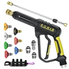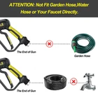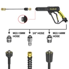 【Premium pressure washer gun】3600 PSI Max pressure, 8GPM Max Flow. Max temperature of water is rated to 60℃ / 140 F. With M22-14 and M22-15 fittings and 3/8'' connector for direct connection to 14mm or 15mm or 3/8'' inner diameter pressure hose fittings 【Compatible pressure washer】With different fittings like M22 14mm fitting,is compatible with Simpson, CraftsmanBriggs Stratton,Karcher, Ryobi pressure washer. M22 15mm fitting is compatible with Sun Joe, Campbell, MI-T-M, AR Blue, Stanley, Cleanforce, Simoniz power washer.Replacement short pressure washer gun fits gas and electric pressure washer with M22 fitting. 【16 inch Extension Wand】This wand make the total length of the gun 30 inches(If you need to connect the extension wand, please use a wrench to remove the 1/4 quick connector on the gun head). 【1/4''standard quick connector】Can be used with any accessory with a 1/4'' plug. Such as nozzles tips, foam cannon, water broom, pivoting coupler, undercarriage cleaner, surface cleaner. Comfortable handle design for easy handling. 【Package include】 1 x 3600psi pressure washer gun,1 x Extension wand,1 x M22 14mm conver fitting, 1 x M22 15mm conver fitting,1 x 3/8" quick connect fitting, 1 x pressure washer nozzle holder, 7 x pressure washer nozzles with different spray angle,Choose different nozzle according to your needs.
