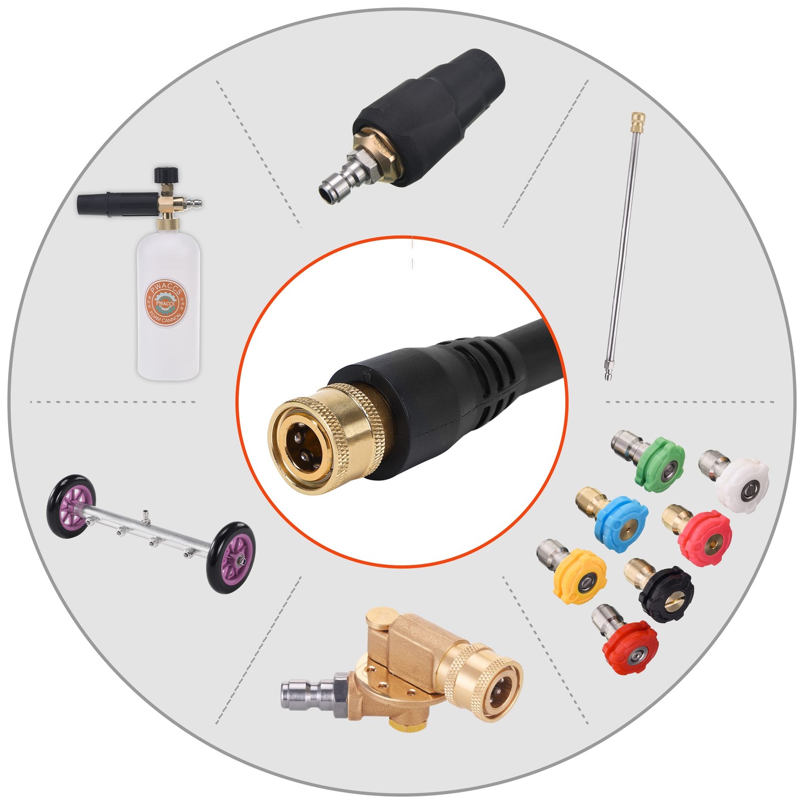 SPECIFICATION — Used with ELECTRIC PRESSURE WASHERS only ,do not fit gas pressure washers! The rated pressure of the power washer gun is 1500-2000 psi, higher pressure may cause the pressure washer spray gun to be damaged. BROAD APPLICATION — The pressure washer gun kit is designed for cleaning cars and houses. It is suitable for cleaning enthusiasts to wash their vehicles, trucks and other automobiles. The pressure washer handle is also used in rinsing walls, fences, windows and decks for professionals. BAYONET FITTING — The pressure washer parts works with specific brands of power washers, especially compatible with Ryobi RY14122 RY141600 RY141900, Karcher K1700 K1710 K1800, PowerStroke 1900PSI 308760059 & 308494075 and Green works. M22-14MM THREAD — Ryobi pressure washer gun has standard M22-14mm fitting, which means a good compatibility to most pressure washer hose in the market. FULLY EQUIPPED — The pressure washer accessories includes a 17" pressure washer gun, a 16" pressure washer spray wand, 5 nozzle tips and a nozzle holder. Apply different nozzles(0°, 15°, 25°, 40°, 65°) to different conditions SPECIFICATION — Used with ELECTRIC PRESSURE WASHERS only ,do not fit gas pressure washers! The working pressure of the power washer gun is 1500 psi and maximum pressure is 2000 psi, higher pressure may cause the pressure washer spray gun to be damaged. BROAD APPLICATION — The pressure washer gun kit is designed for cleaning cars and houses. It is suitable for cleaning enthusiasts to wash their vehicles, trucks and other automobiles. The pressure washer handle is also used in rinsing walls, fences, windows and decks for professionals. BAYONET FITTING — The pressure washer parts works with specific brands of power washers, especially compatible with Ryobi RY14122 RY141600 RY141900, Karcher K1700 K1710 K1800, PowerStroke 1900PSI 308760059 & 308494075 and Green works. M22-14MM THREAD — Ryobi pressure washer gun has standard M22-14mm fitting, which means a good compatibility to most pressure washer hose in the market. FULLY EQUIPPED — The pressure washer accessories includes a 17" pressure washer gun, a 16" pressure washer spray wand, 5 nozzle tips and a nozzle holder. Apply different nozzles(0°, 15°, 25°, 40°, 65°) to different conditions.