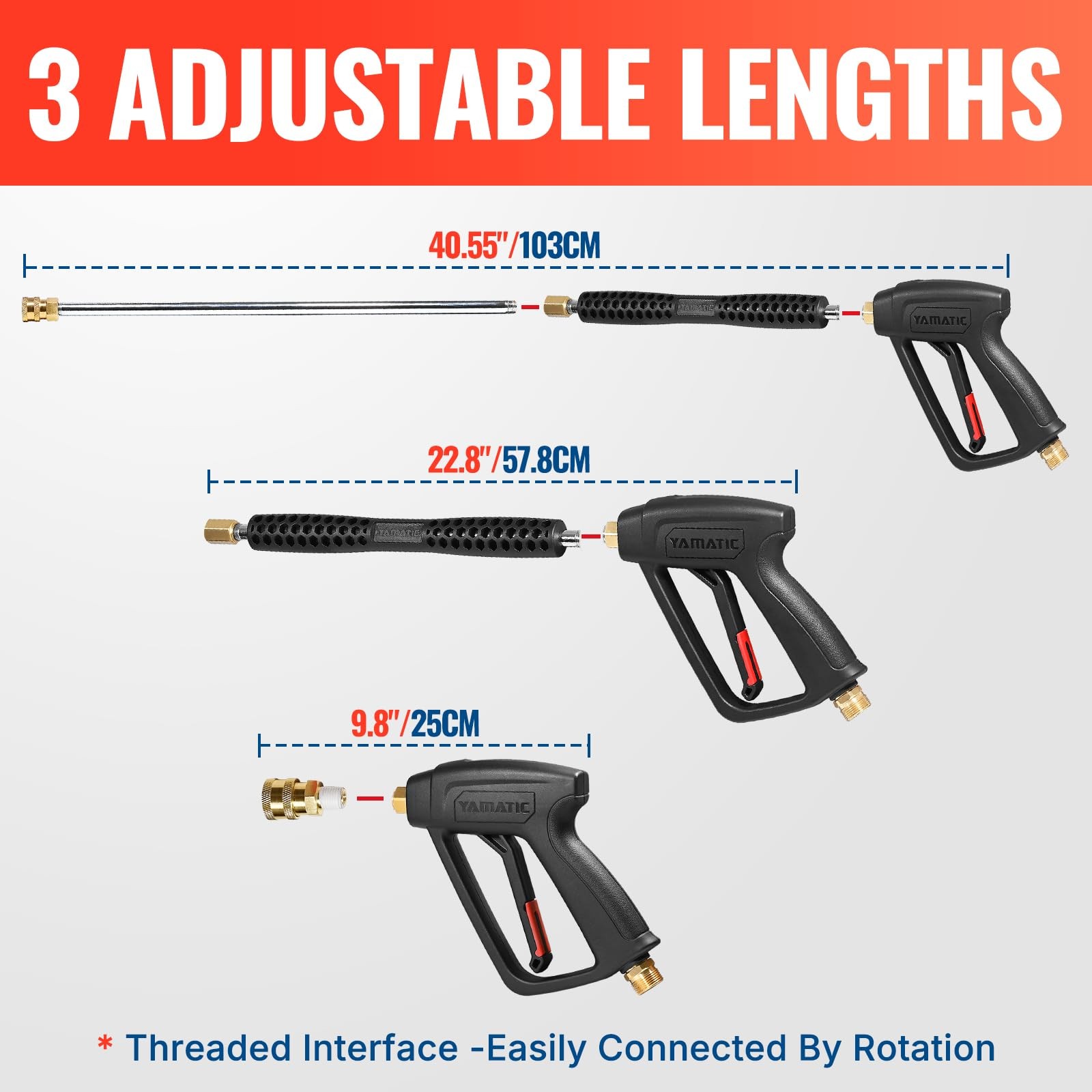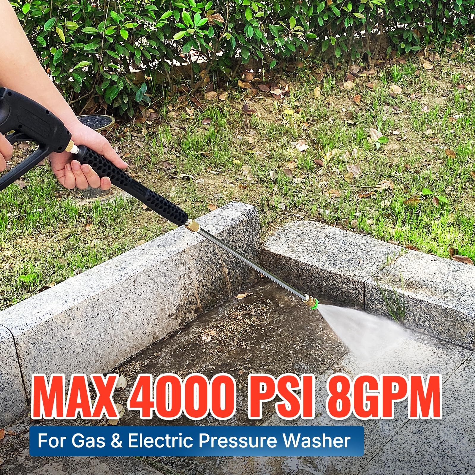 High Pressure Washer Gun Features: [Commercial Performance] This pressure washer gun kit is manufactured with shockproof reinforced material. Engineered with a sturdy and durable structure, ensuring it won't break or bend under pressure. Max. 4000 PSI 8 GPM, Max temperature of water is rated to 60℃ / 140℉. Suitable for both electric and gasoline pressure washers. Compatible with Simpson, Briggs & Stratton, CRAFTSMAN, Champion, Honda, Excell, Ryobi, Sun Joe and other high pressure washers. PLEASE NOTE: NOT FIT GARDEN HOSE, WATER HOSE OR FAUCET. [Flexible Extension Wands] Power washer trigger gun with 2 extension lances, could be removed or extended to 3 lengths as you wish, which can cope with the cleaning tasks of different heights and angles so that you can finish the cleaning work more conveniently and It also saves storage space. Package Include: 1* Pressure Washer Gun 2* Pressure Washer Wands 1* M22-14mm female to M22-15mm male adpater 5* pressure washer spray nozzle tips [Value Service] Please feel free to message us if you have any item or technical problems with this power washer gun and wand kit, we provide 7X24 hours of customer service. Welcome to check other pressure washer accessories at the Power Center Store. [Upgrade Pressure Washer Wand] This pressure washer gun kit is manufactured with shockproof reinforced material. Engineered with a sturdy and durable structure, ensuring it won't break or bend under pressure. Max. 4000 PSI, suitable for both electric and gas power washers. Compatible with Greenworks,Ryobi, Briggs & Stratton, Craftsman, Champion, Honda, Troy Bilt, Simpson, Karcher and more high pressurewashers. PLEASE NOTE: Not fit garden hose, water hose or faucet. [Flexible Extension Lances] Power washer gun comes with 2 extension wands, could be removed or extended to 3 lengths and up to 40inch length, suitable for cleaning cars, pool, windows, roofs, sidewalks, auto detailing business, and more high pressure working. [Maneuverable Design] The lightweight pull-trigger and shockproof handle design allows you to hold the pressure washer handle for extended periods without fatigue. The power washer gun comes with dual lance for further extension, adjust the length as you wish. [Quality Craftsmanship] The pressure washer gun comes with solid brass fittings including Teflon tape and lock tite, ensuring durability and leak resistance. The internal trigger is crafted with superior quality solid brass, steel pole [M22 Adaptability] This pressure washer handle comes with M22-14mm male inlet with an extra M22-15mm male coupler, which fits all M22 thread pressure washer hoses. The universal 1/4" quick connector outlet is compatible with high-pressure foam cannon, spray nozzle tips, turbo nozzle, surface cleaner, undercarriage cleaner and more accessories to improve your work efficiency. [Value Service] Please feel free to message us if you have any item or technical problems with this power washer gun and wand kit, we provide 7X24 hours of customer service. Welcome to check other pressure washer accessories at Power Center Store.